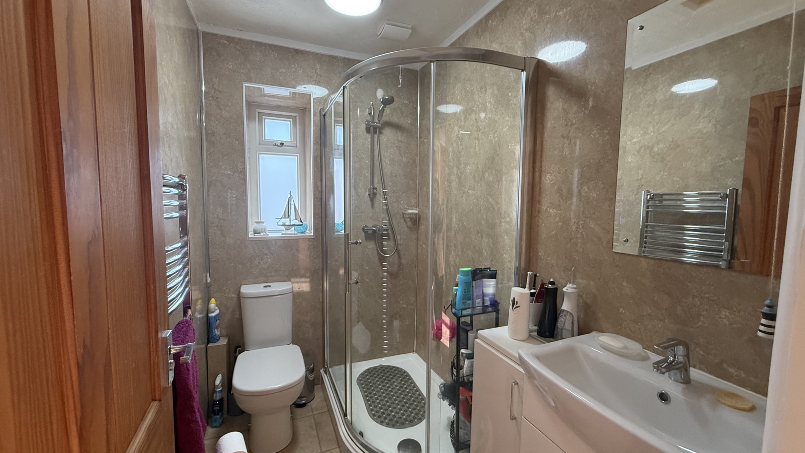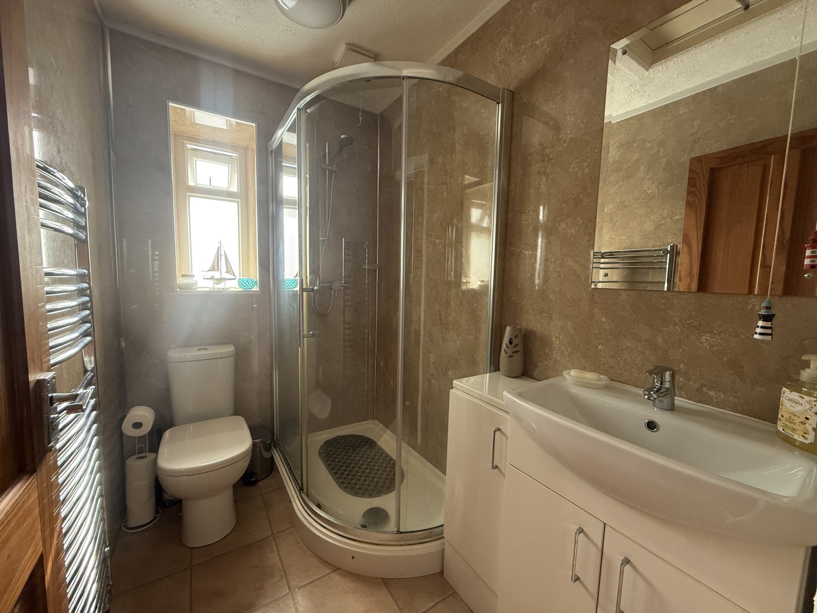 Modern and well-appointed bathroom finished in neutral tones with marble-effect walls and tiled flooring. Features include a corner shower with curved glass enclosure, vanity sink with storage, and wall-mounted towel warmer. Compact yet efficiently laid out, the space offers a clean, contemporary feel—ideal for everyday comfort and convenience