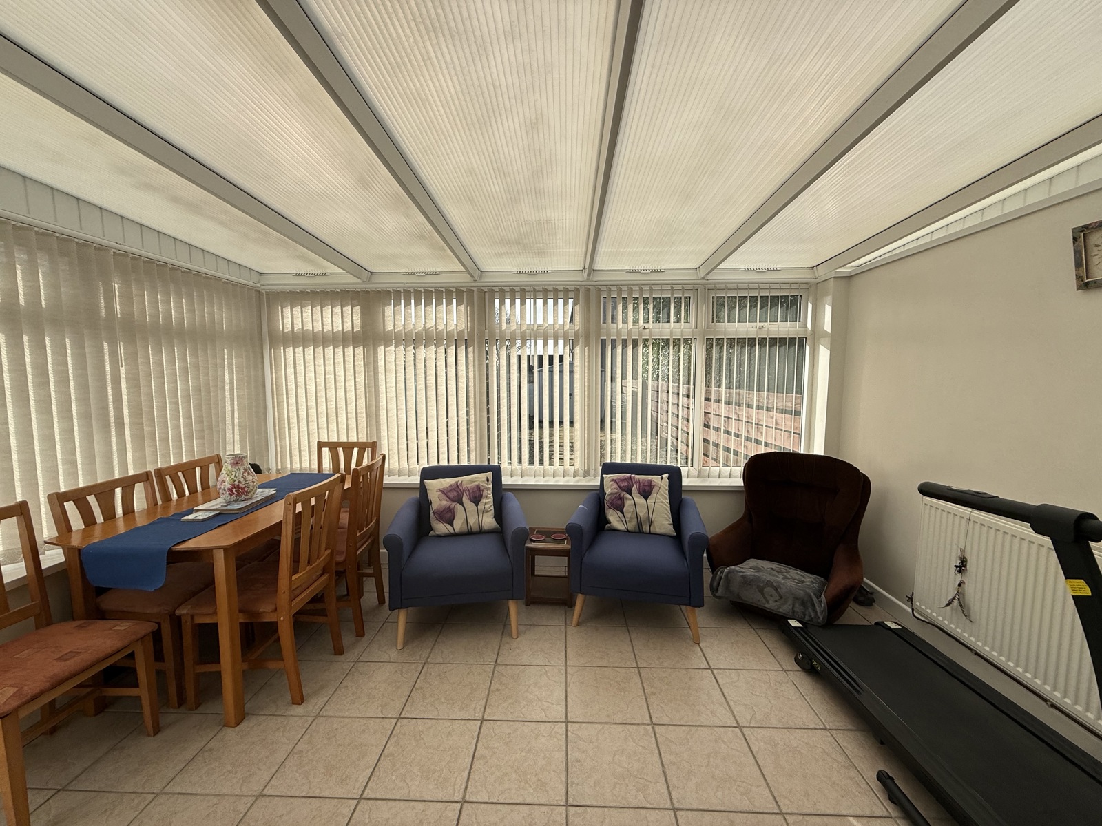 Bright and versatile conservatory with tiled flooring and wraparound windows, offering an abundance of natural light throughout the day. Currently arranged as a relaxed dining and seating area, the space lends itself equally well to entertaining, unwinding, or working from home. A practical and inviting extension of the living space, ideal for year-round enjoyment.
