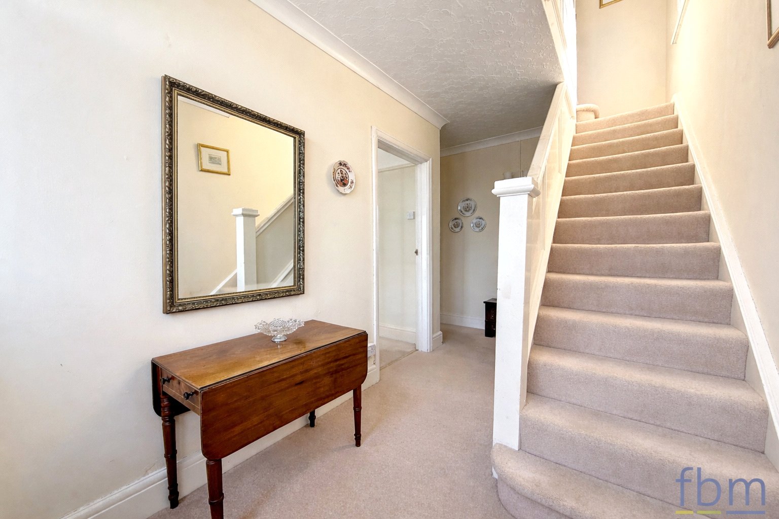 A bright and airy entrance hall accessed via a uPVC front door with side windows, featuring carpeted flooring, a radiator, and a useful understairs storage cupboard.