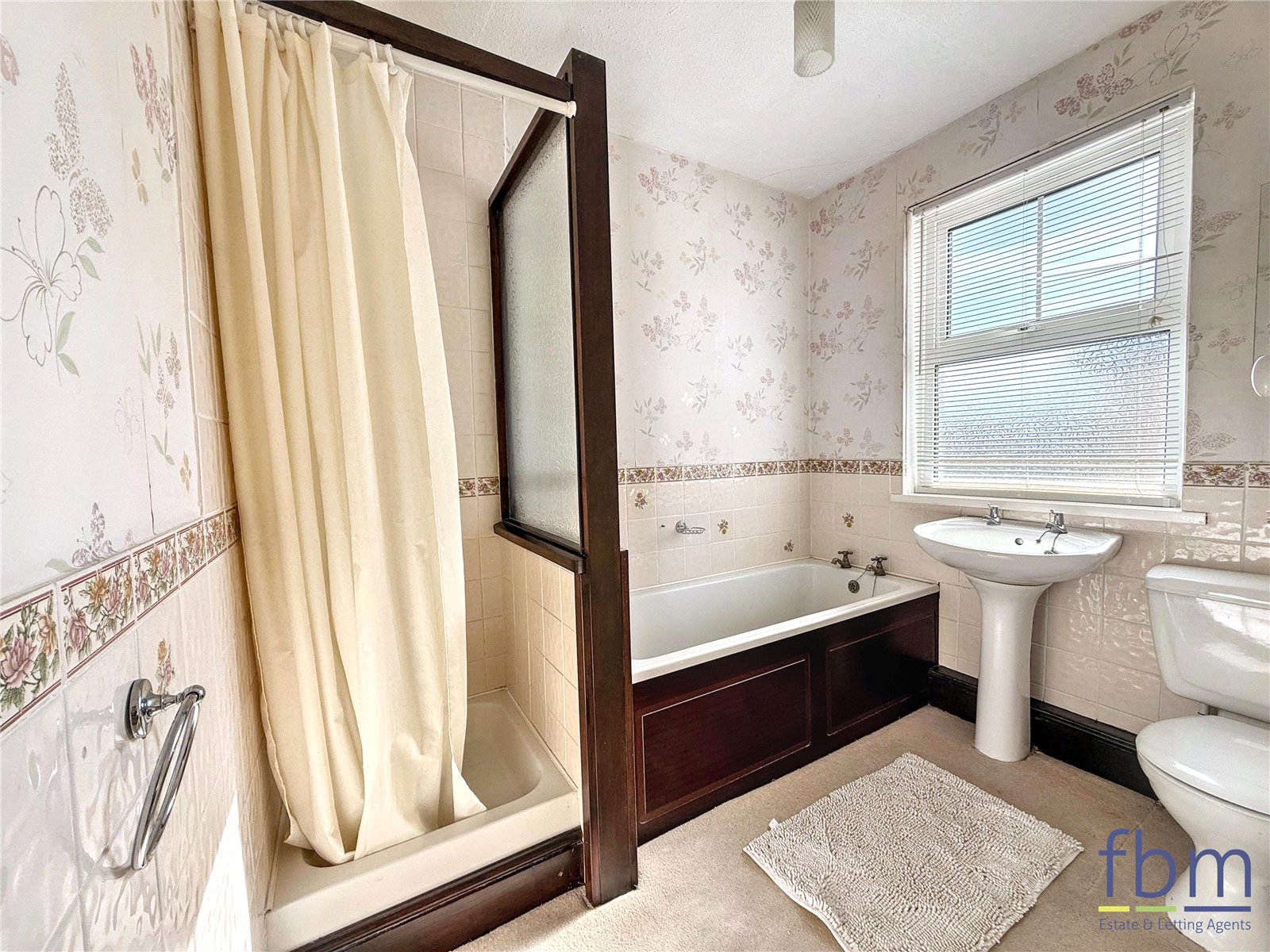 A bathroom with partially tiled walls and carpeted flooring, fitted with a bath and shower, wash hand basin, and WC. The room also benefits from a radiator and a uPVC window.