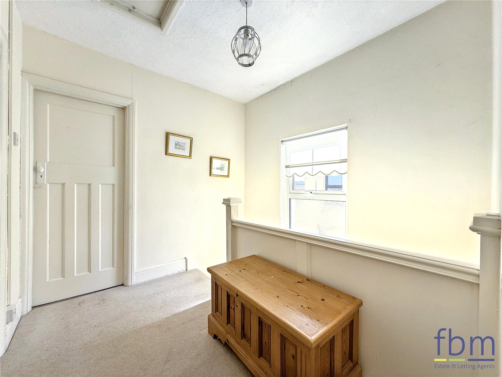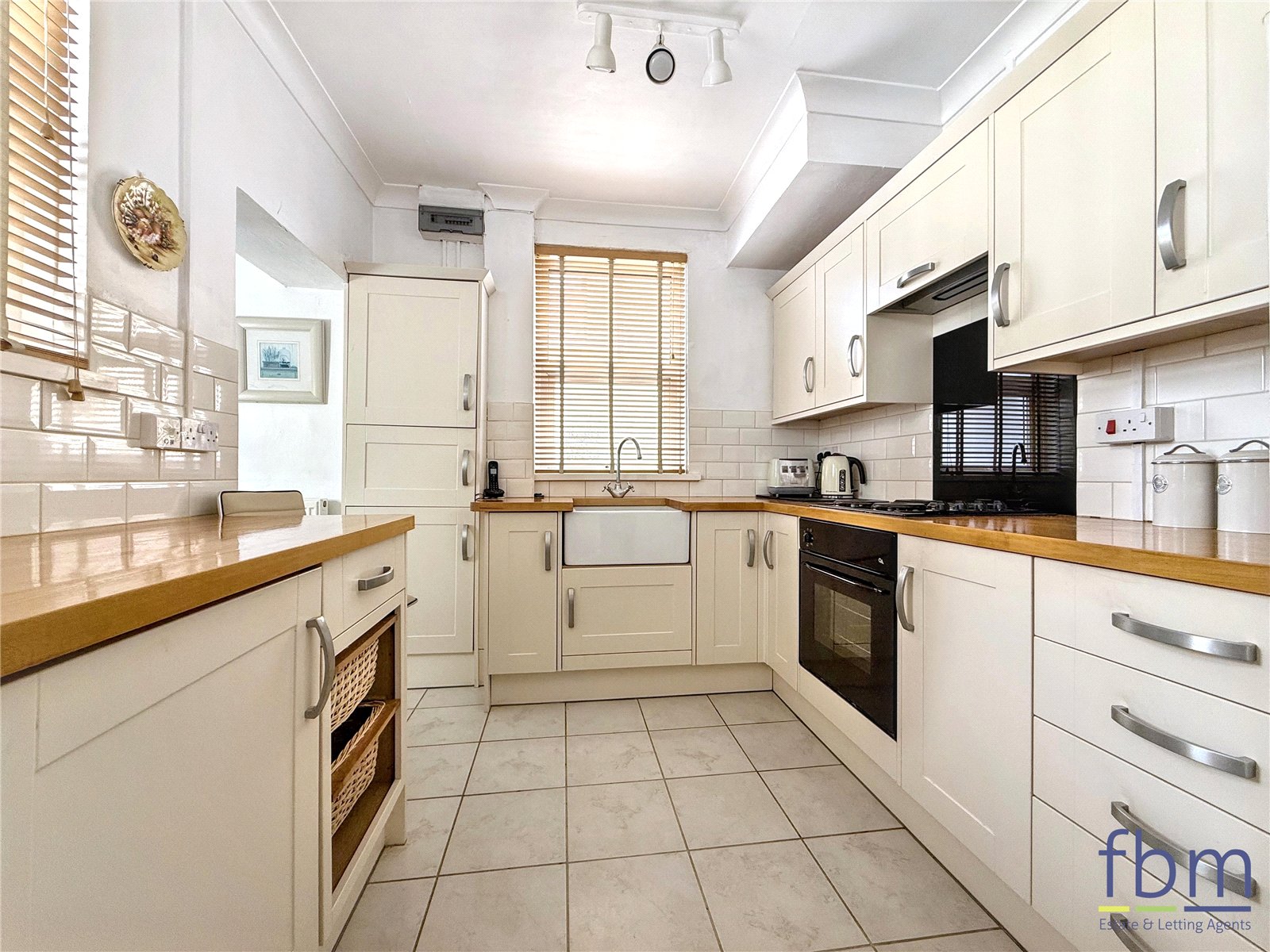 Fitted with a range of wall and base mounted units complemented by brick-effect tiled splashbacks, this kitchen features a Belfast sink, integrated oven and hob with extractor hood, and an integrated fridge. Further benefits include tiled flooring, two uPVC windows providing ample natural light, and a radiator.
