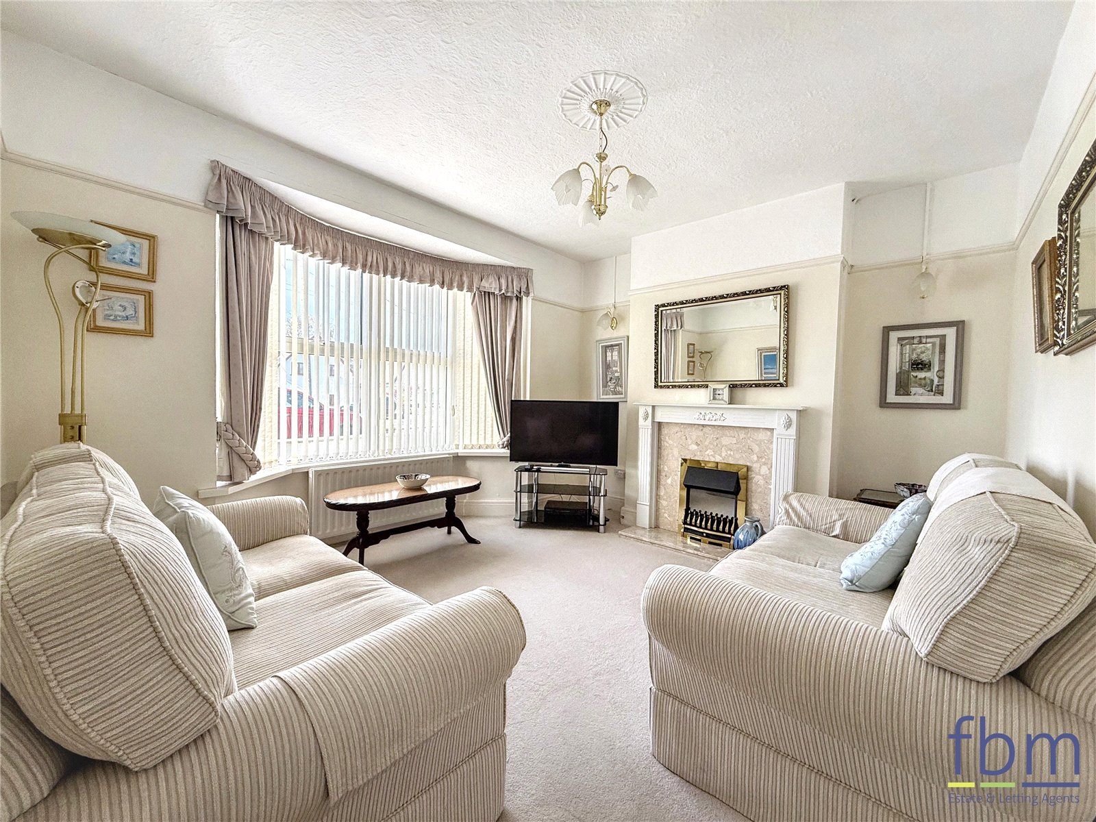 A well-presented, carpeted lounge featuring a uPVC bay window allowing for ample natural light, a radiator, and a feature fireplace creating a focal point to the room.