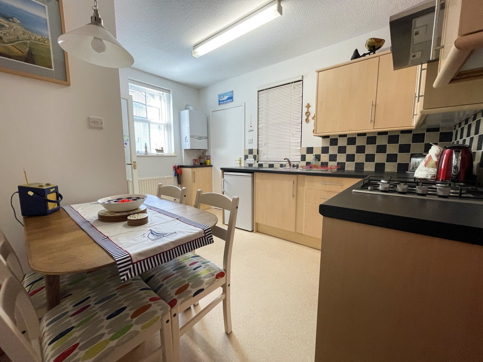 Laminate flooring, range of base and eye level units, sink and drainer, electric oven, gas hob, tile splashback, radiator, double glazed uPVC window to side.