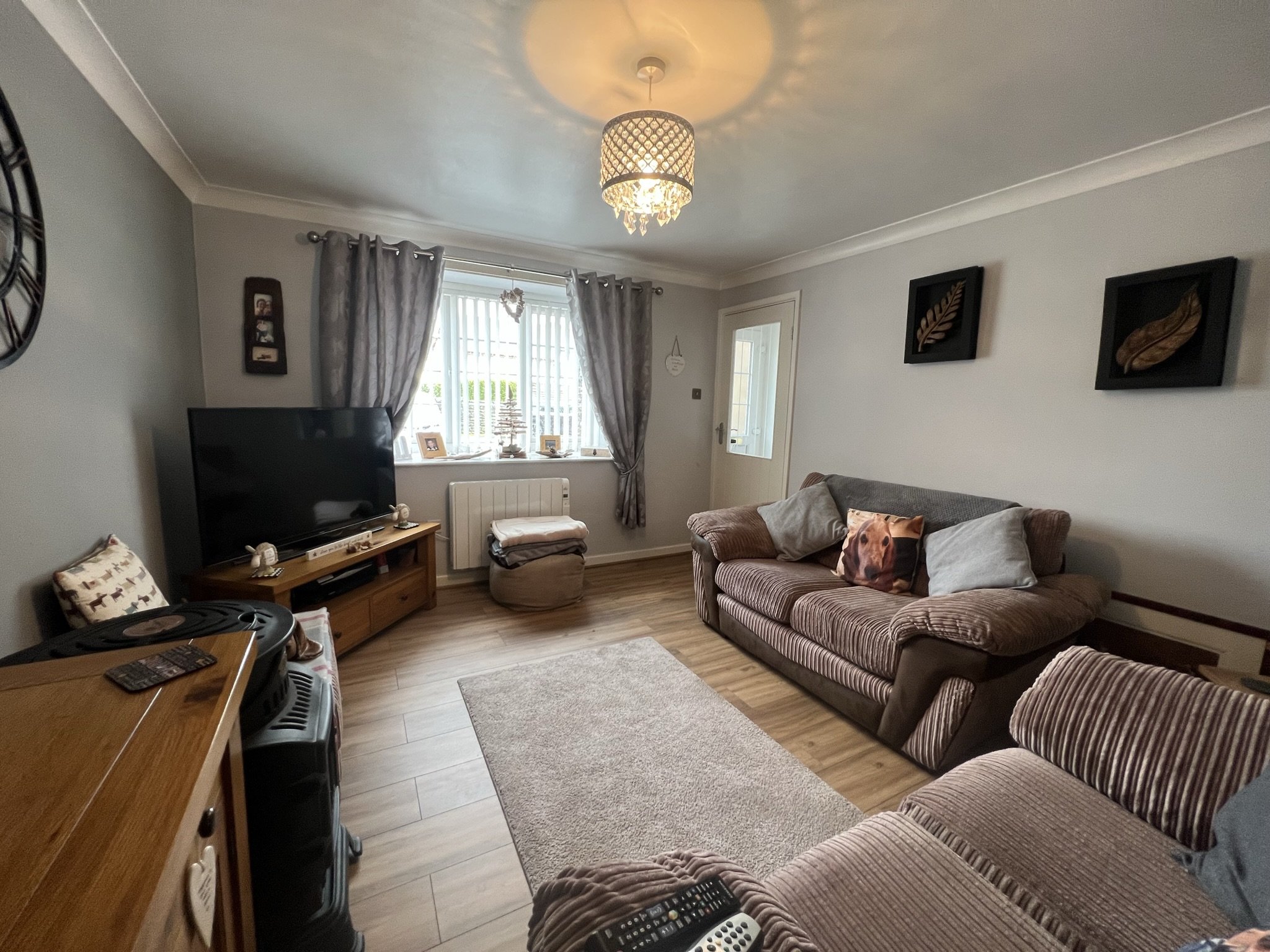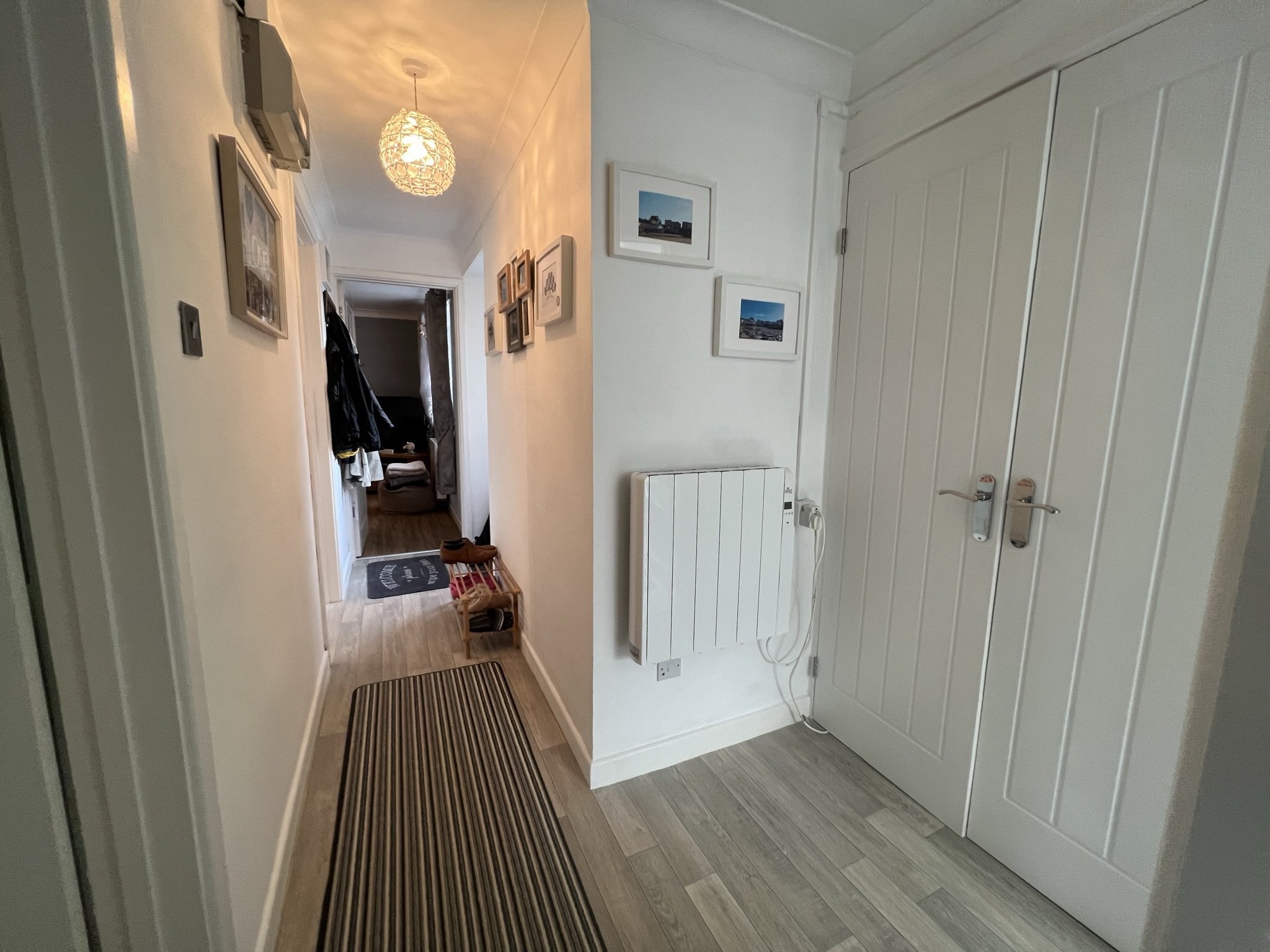 vinyl flooring, central ceiling light, wall mounted electric radiator, uPVC double glazed window facing front of property
