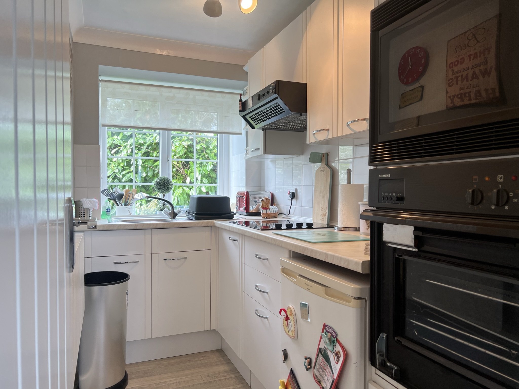 Vinyl flooring, tiled wall, fitted electric hob, central ceiling light and upvc double glazed window facing rear of property