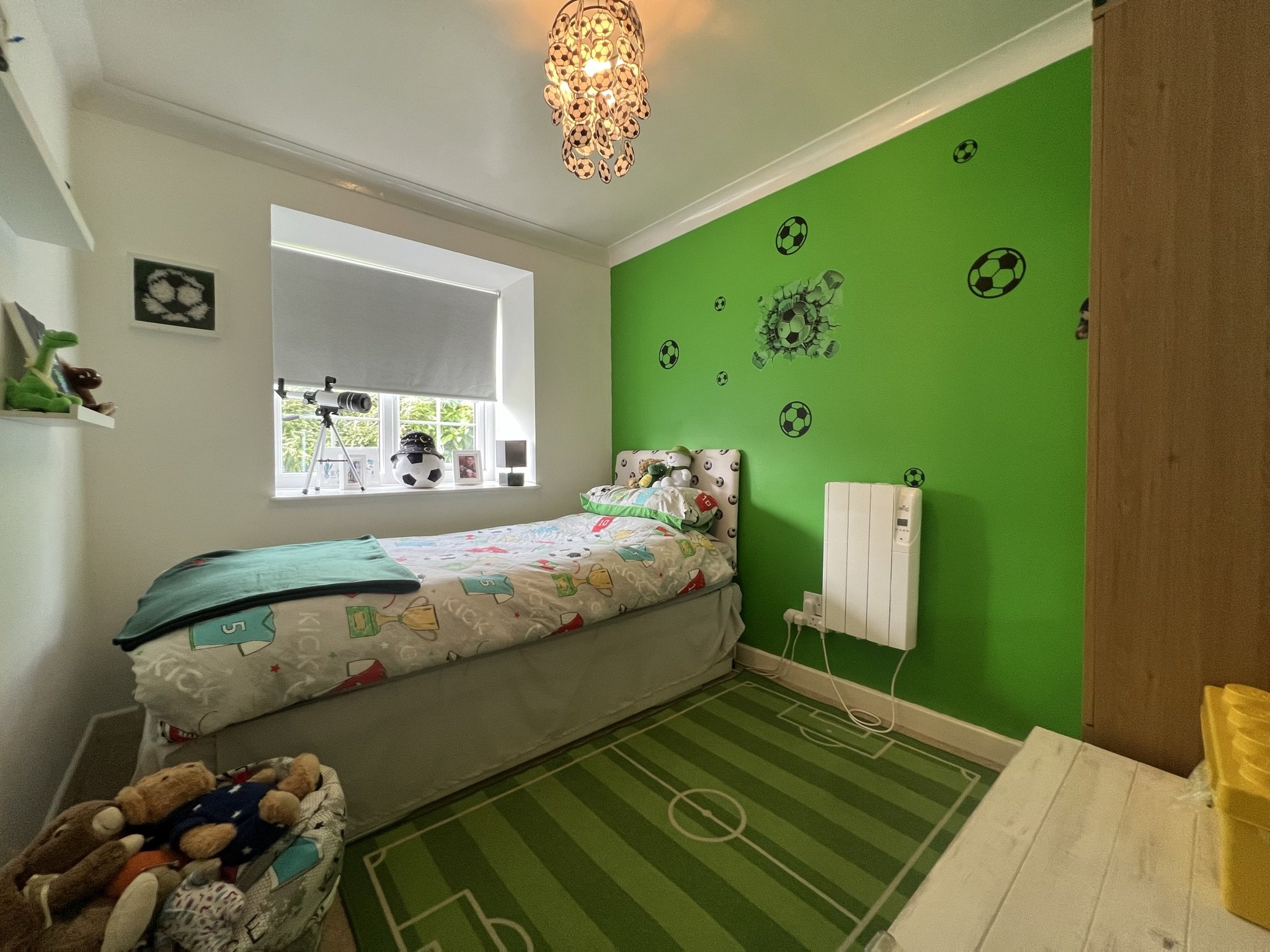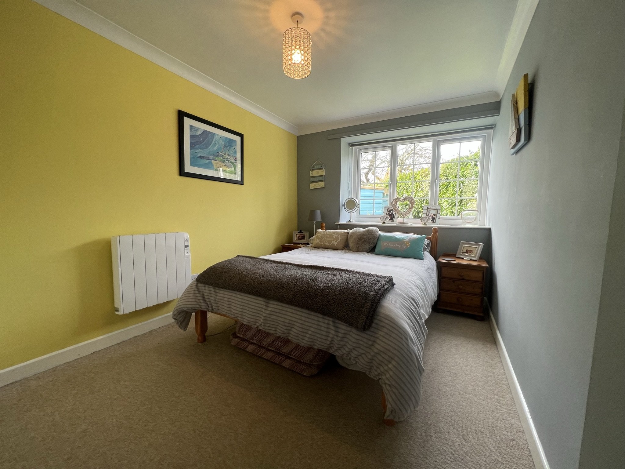 Carpted flooring, wall mounted electric raidiator, uPVC double glazed window facing rear of property