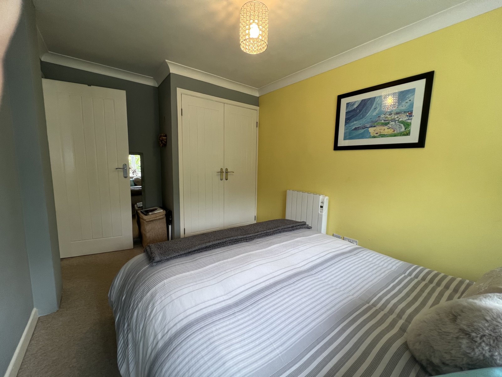 wall mounted electric raidiator, central ceiling light, storage cupboard and water tank, fuze box