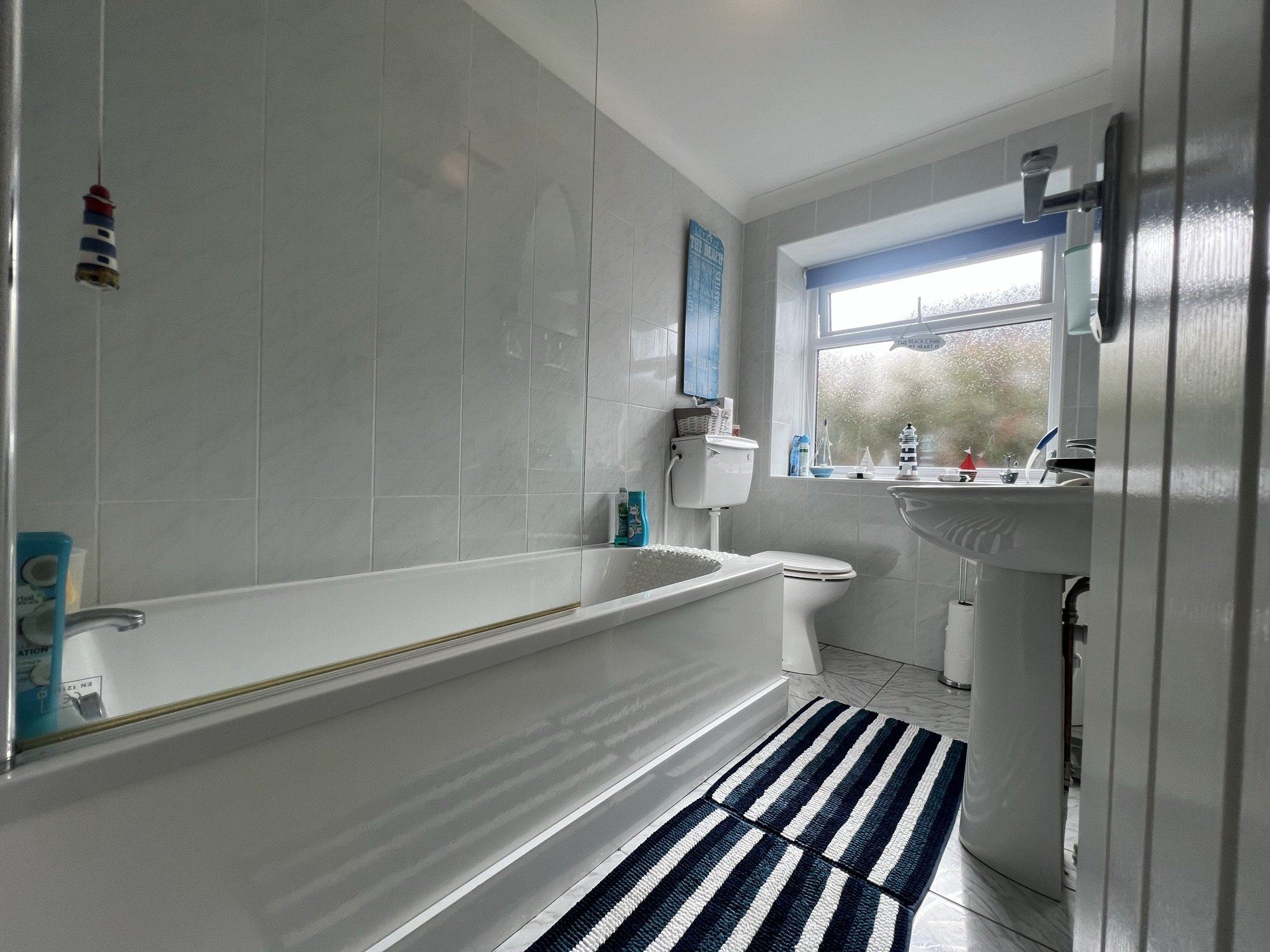 Ceramic twin tap basin, tiled flooring and walls, Bath/shower, toilet and obscure double glazed window.