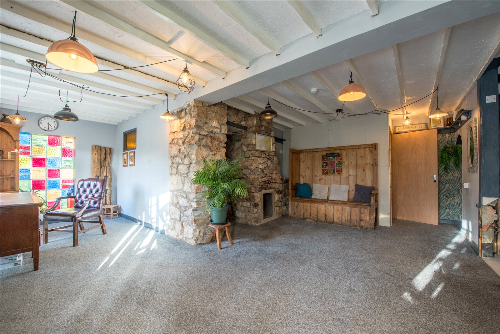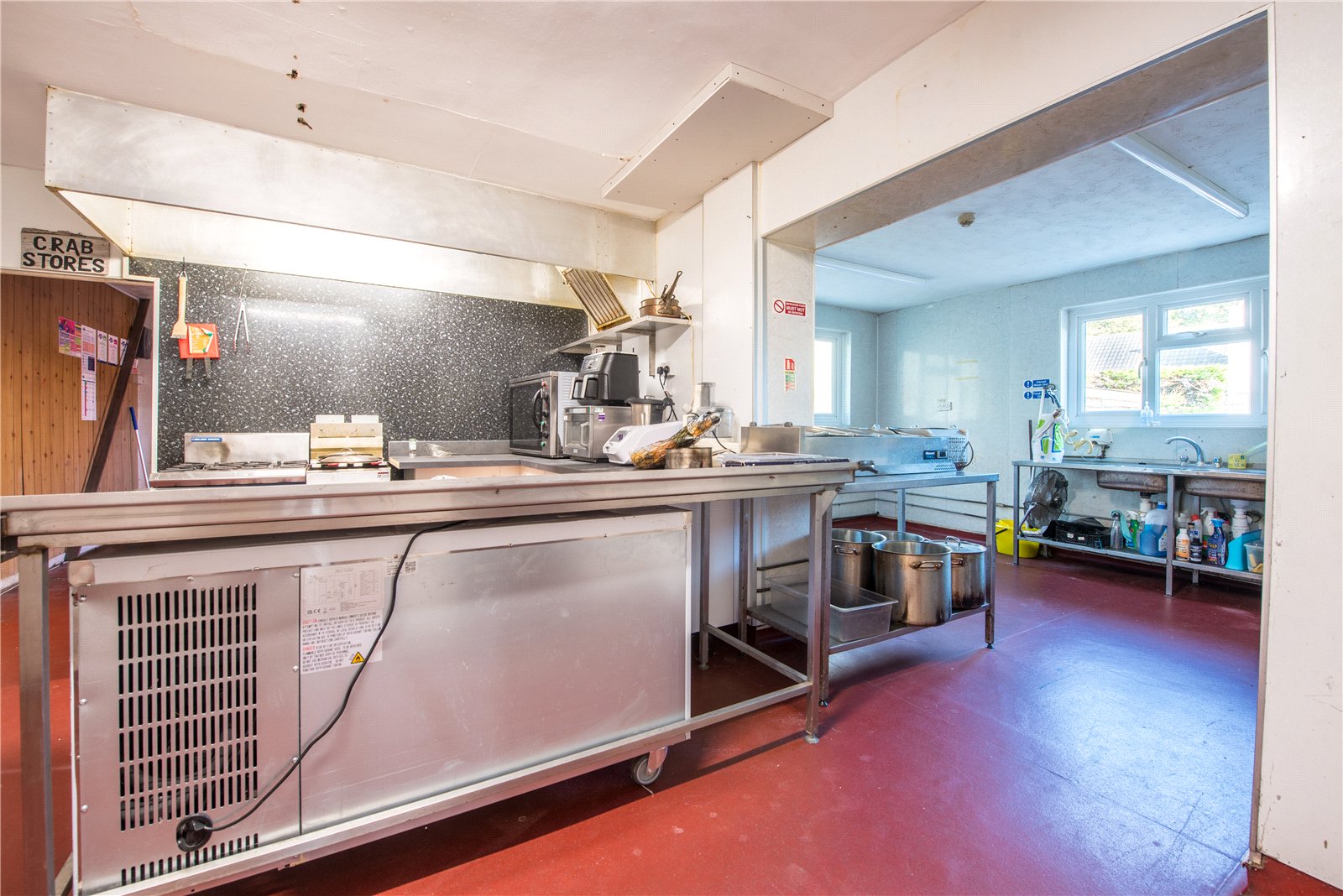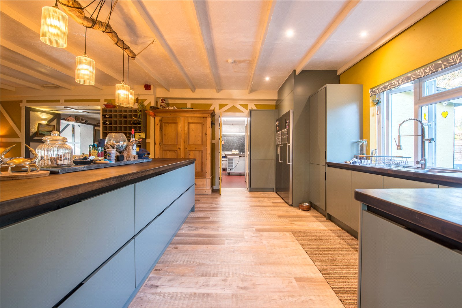 The kitchen comprises a range of wall and base mounted units, along with a central island incorporating a breakfast bar seating area and a feature pendant light above. There is space for a large double fridge and freezer, a sink with vinyl worktops, a large gas cooker, and an extractor fan. A door leads through to the commercial kitchen area, offering excellent versatility for catering or business use.