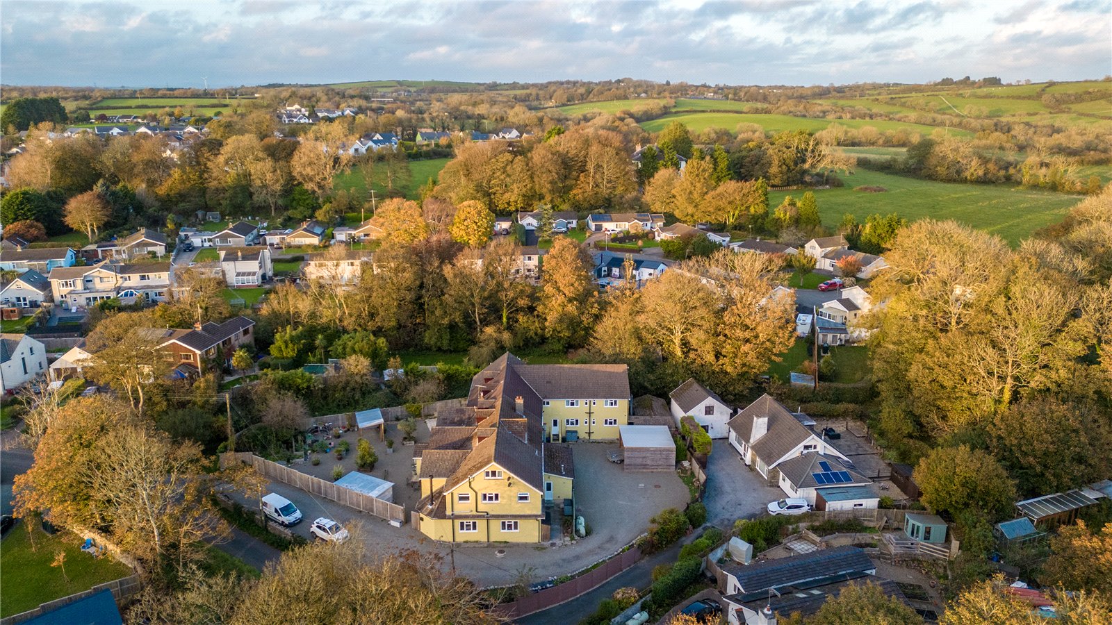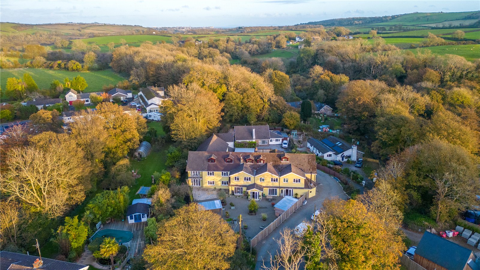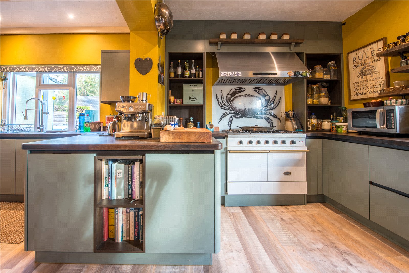 The kitchen comprises a range of wall and base mounted units, along with a central island incorporating a breakfast bar seating area and a feature pendant light above. There is space for a large double fridge and freezer, a sink with vinyl worktops, a large gas cooker, and an extractor fan. A door leads through to the commercial kitchen area, offering excellent versatility for catering or business use.