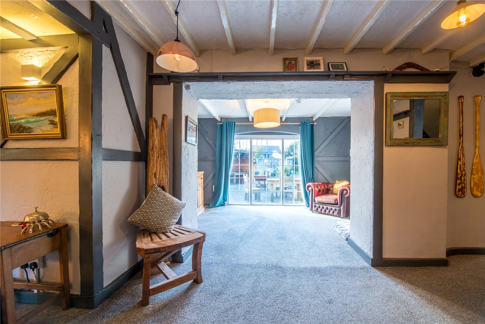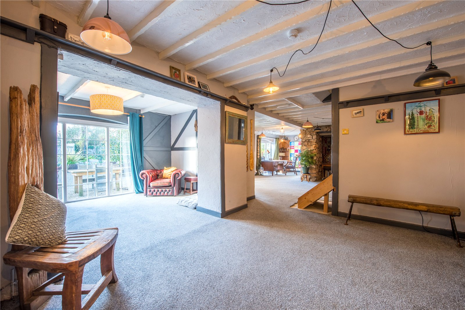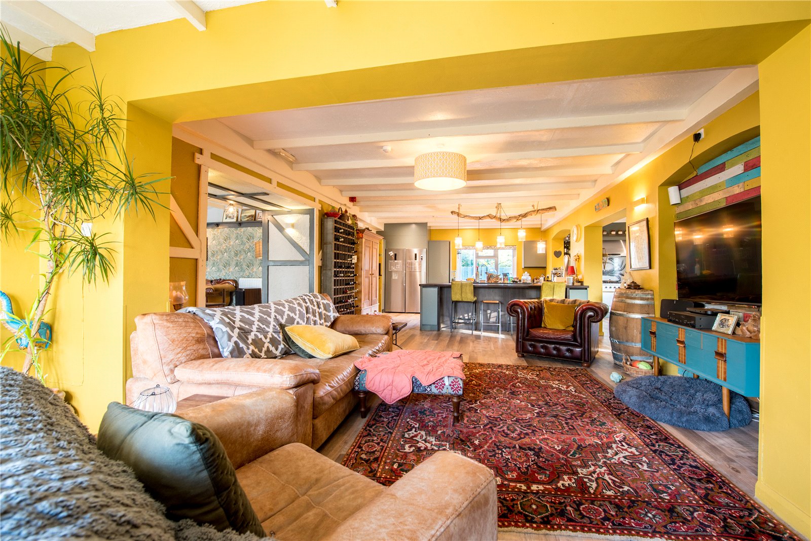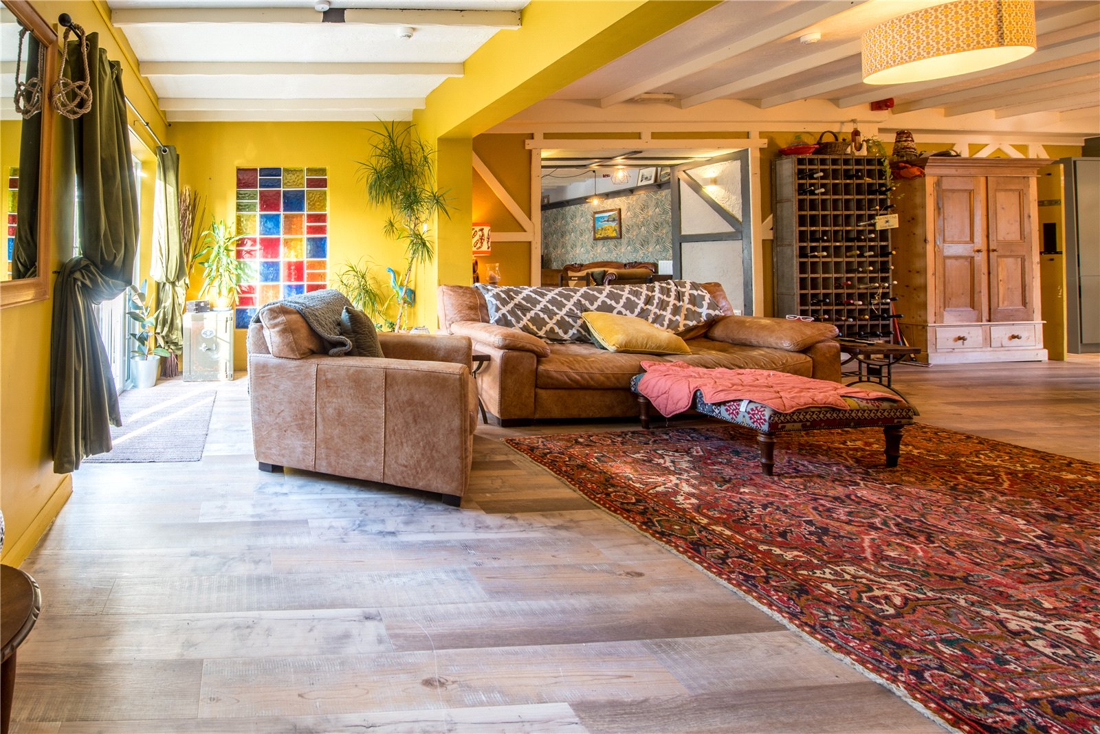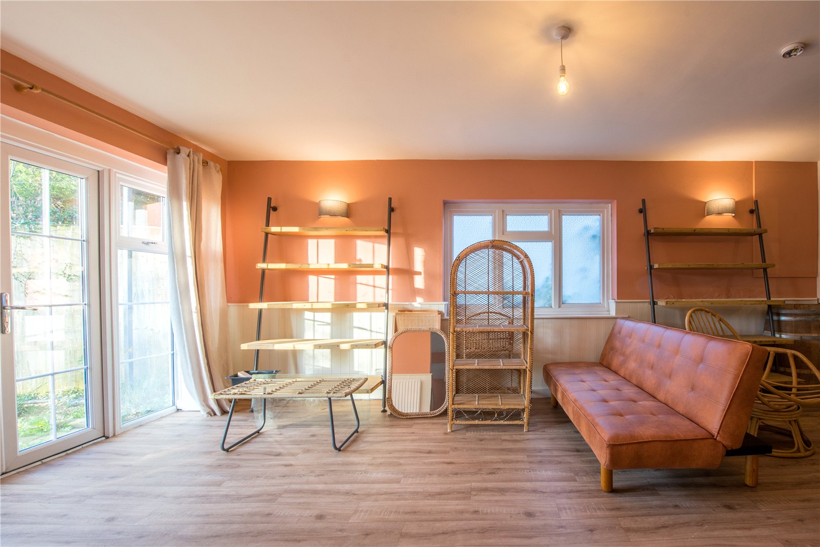 Large double-glazed French doors allow for an abundance of natural light, complemented by additional double-glazed windows. The room benefits from laminate flooring throughout and features a large log burner, creating a warm and inviting focal point.