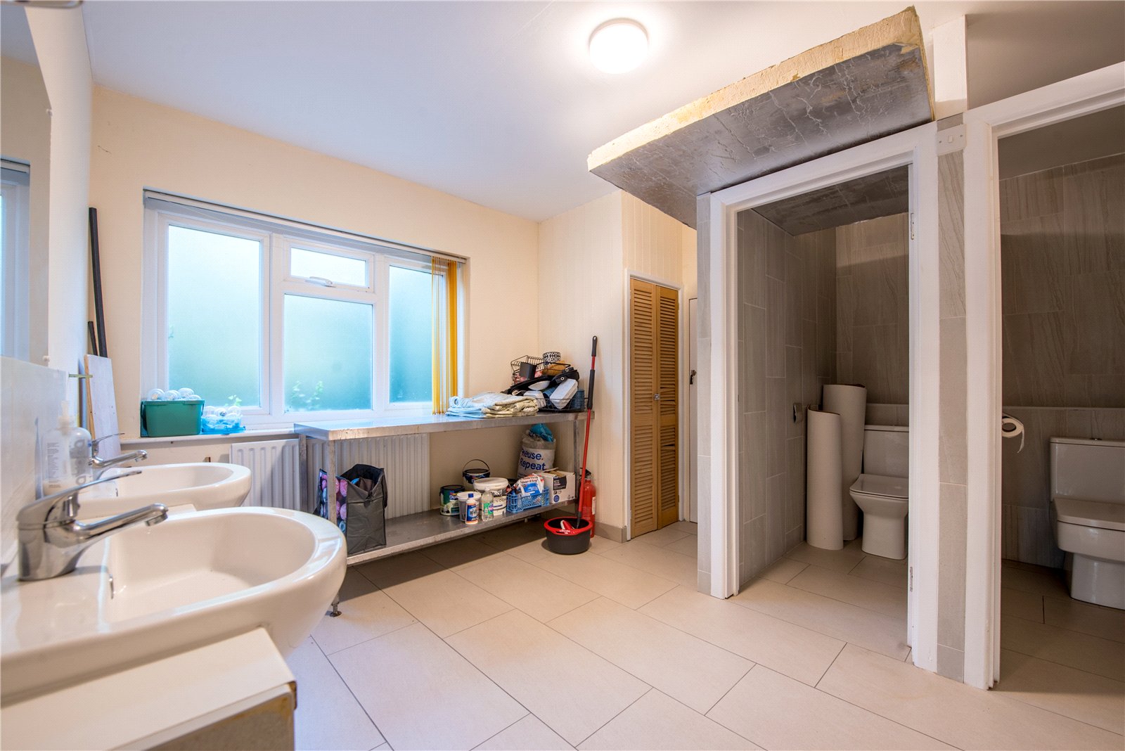 Tiled flooring, two WC cubicles, two white sink basins, and double-glazed frosted uPVC windows.