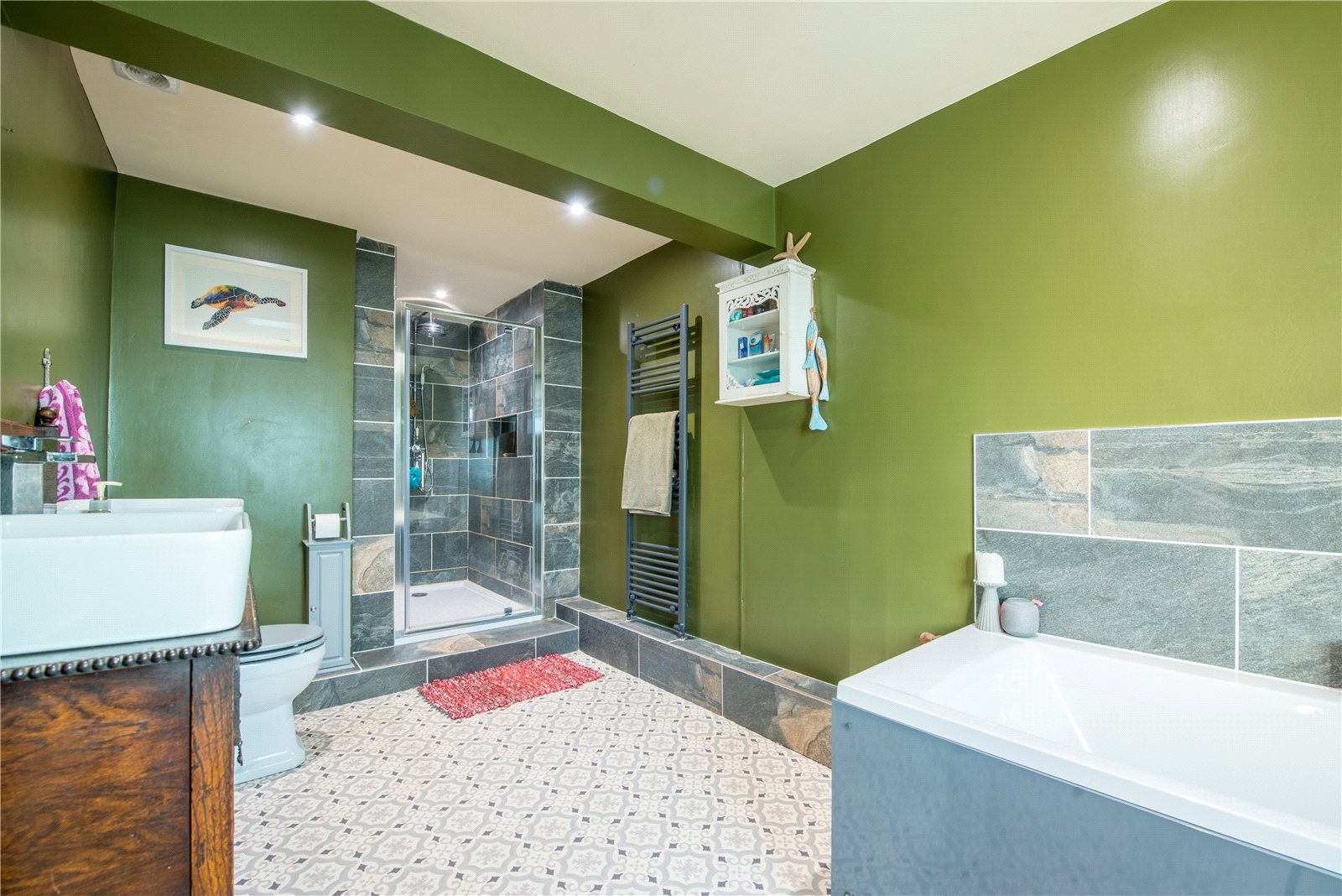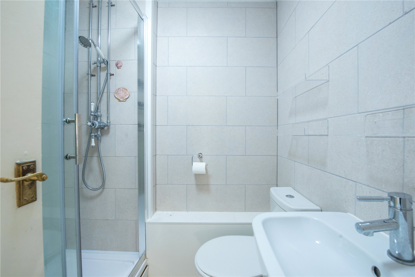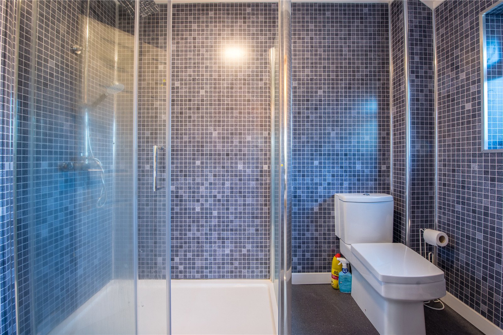 Fully fitted with aqua-panelled walls, vinyl flooring, shower tray, WC and wash hand basin.