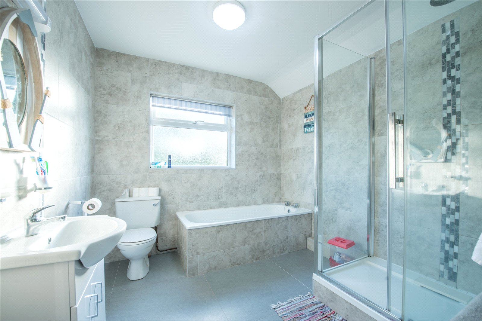 A spacious bathroom featuring a his and hers double vanity unit, bath, fully tiled shower enclosure with glass screen, heated towel rail, tiled flooring and a double glazed UPVC obscured window.