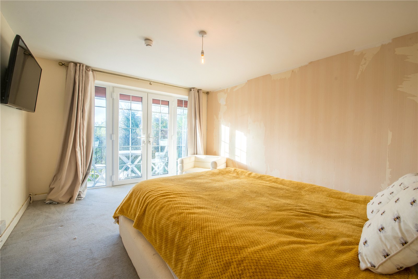 Double glazed UPVC French doors leading onto a balcony overlooking the front garden, with carpeted flooring.