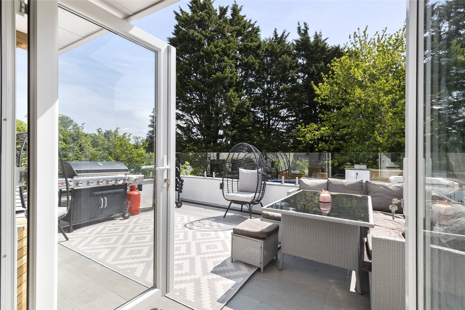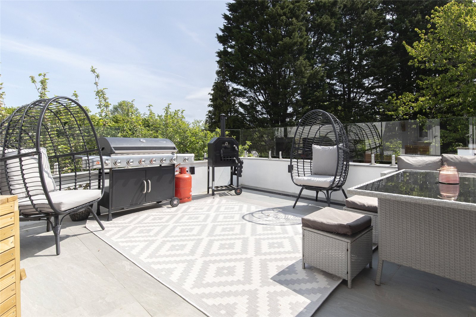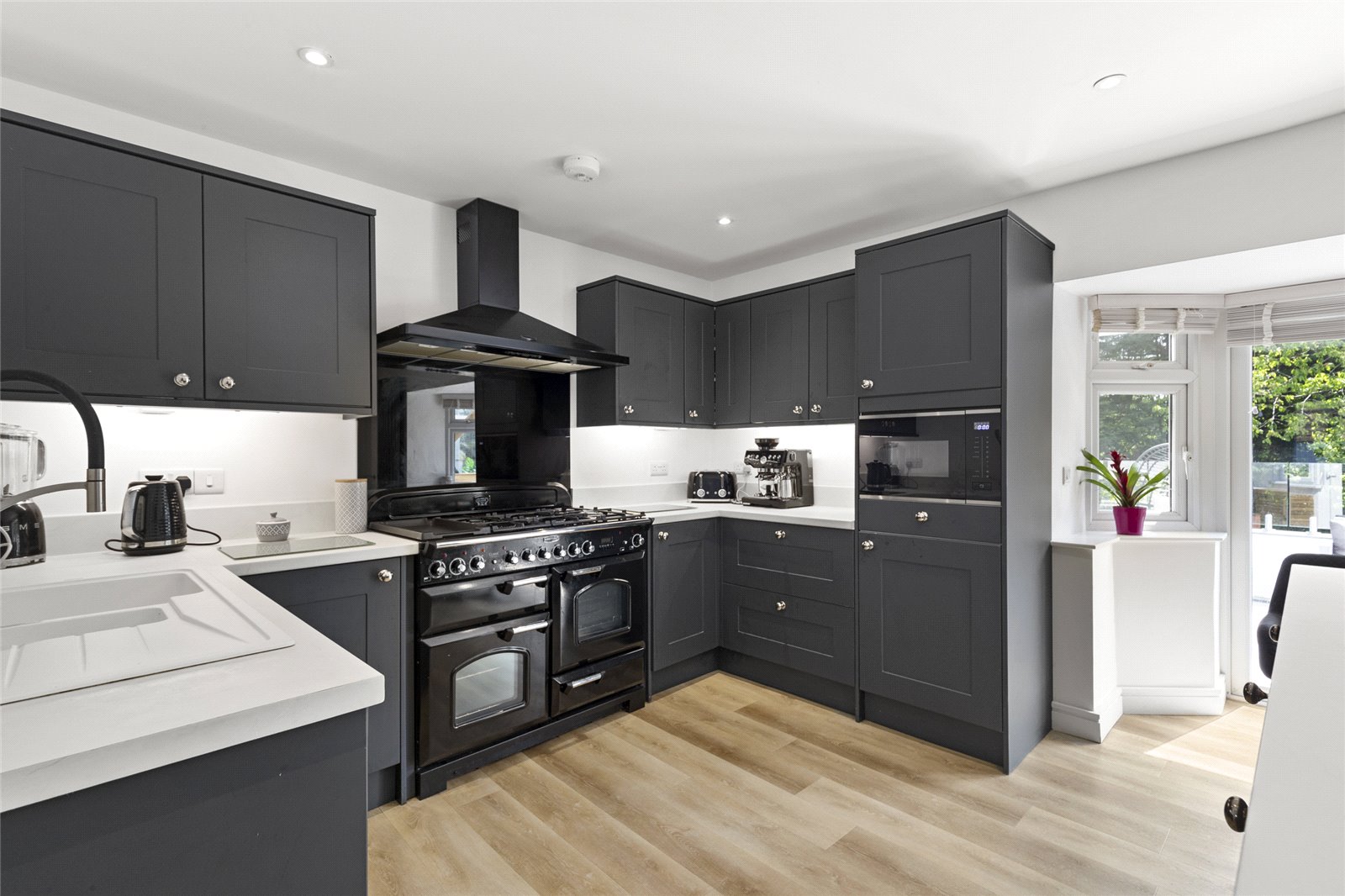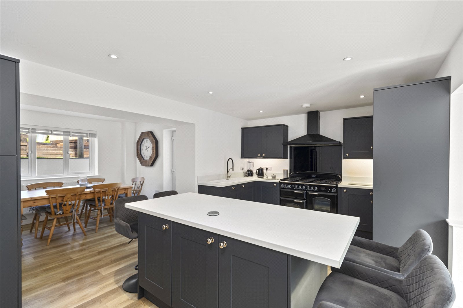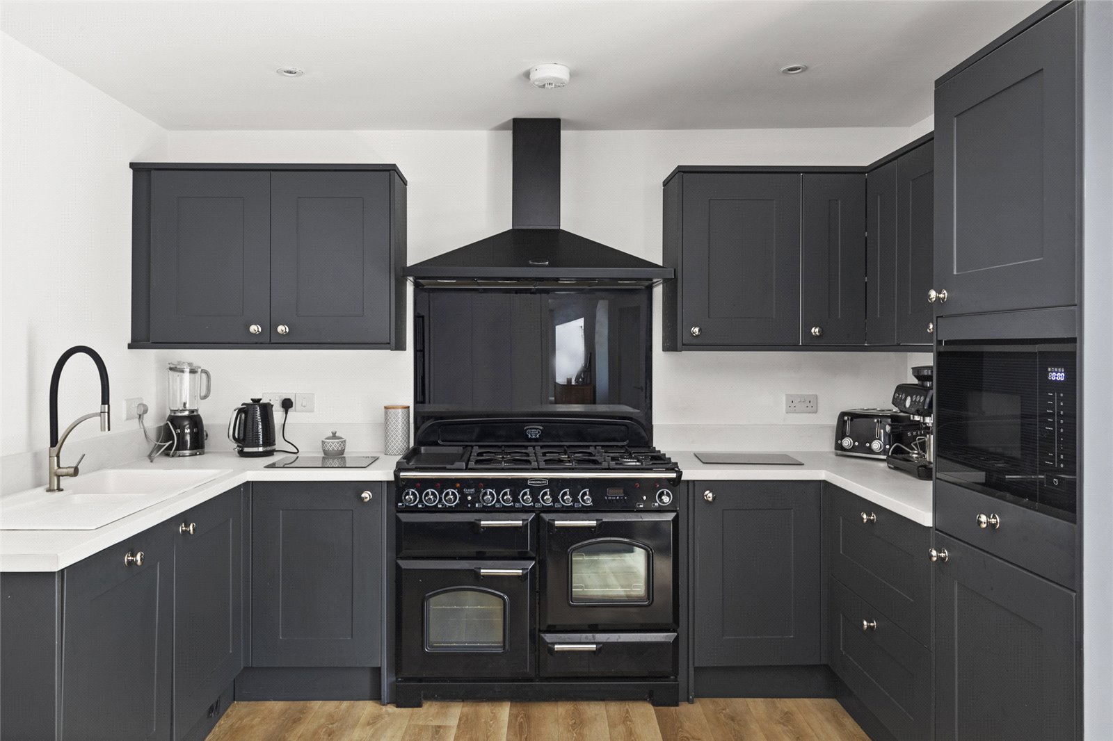 LVT flooring, range of base and eye level units with marble effect worktops and matching island, 1.5 sink and draining board, space for cooker with extractor over, built in microwave and dishwasher, space for American fridge freezer with unit surround, built in larder cupboard, two radiators, double glazed uPVc window to rear and door to side, double glazed uPVC patio doors accessing front al fresco dining area.