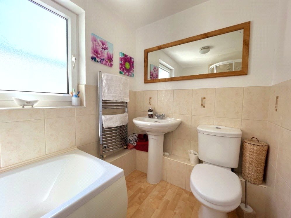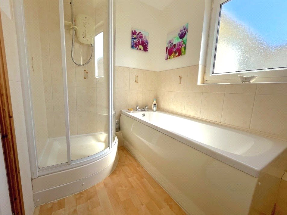 Vinyl flooring, shower, bath, wash hand basin, WC, heated towel rail, partially tiled wall, obscure glass double glazed uPVC window to side.