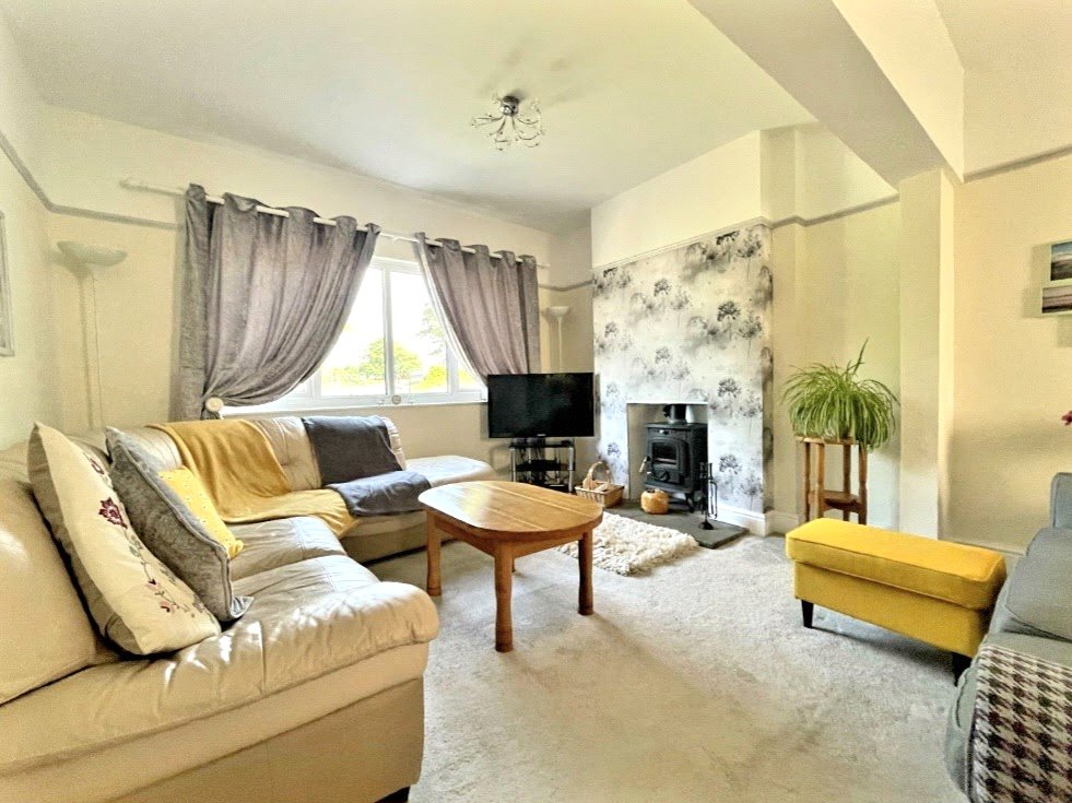 Carpet flooring, log burner with stone hearth, under stairs storage, triple glazed uPVC window to fore, radiator.