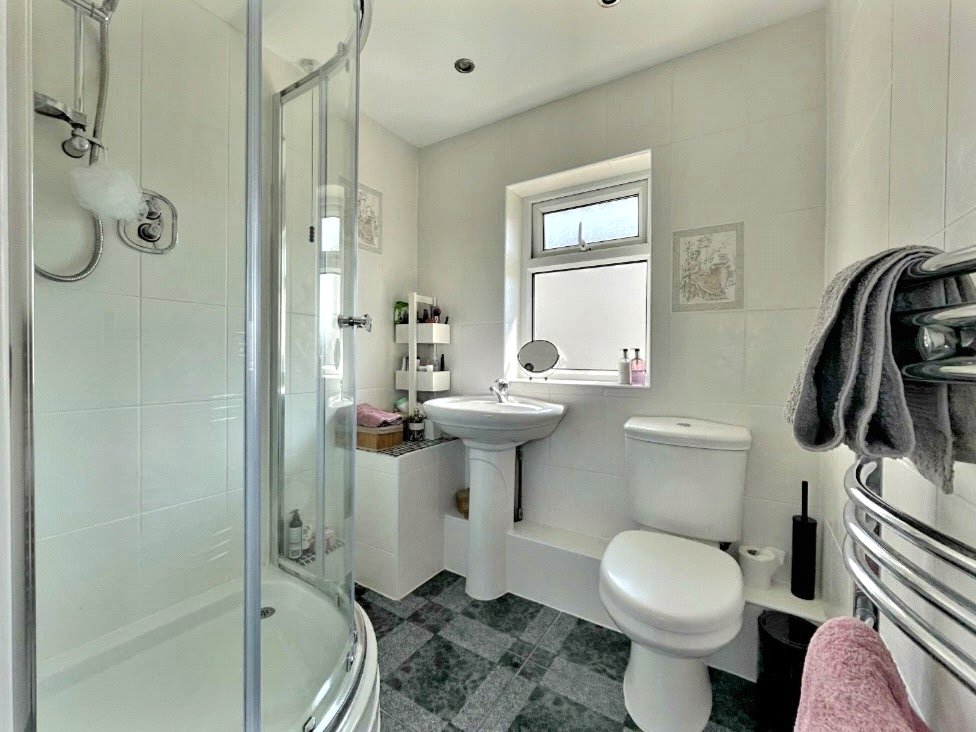 Tile flooring, tile walls, heated towel rails, shower, WC, wash hand basin, obscure glass uPVC double glazed window to side.