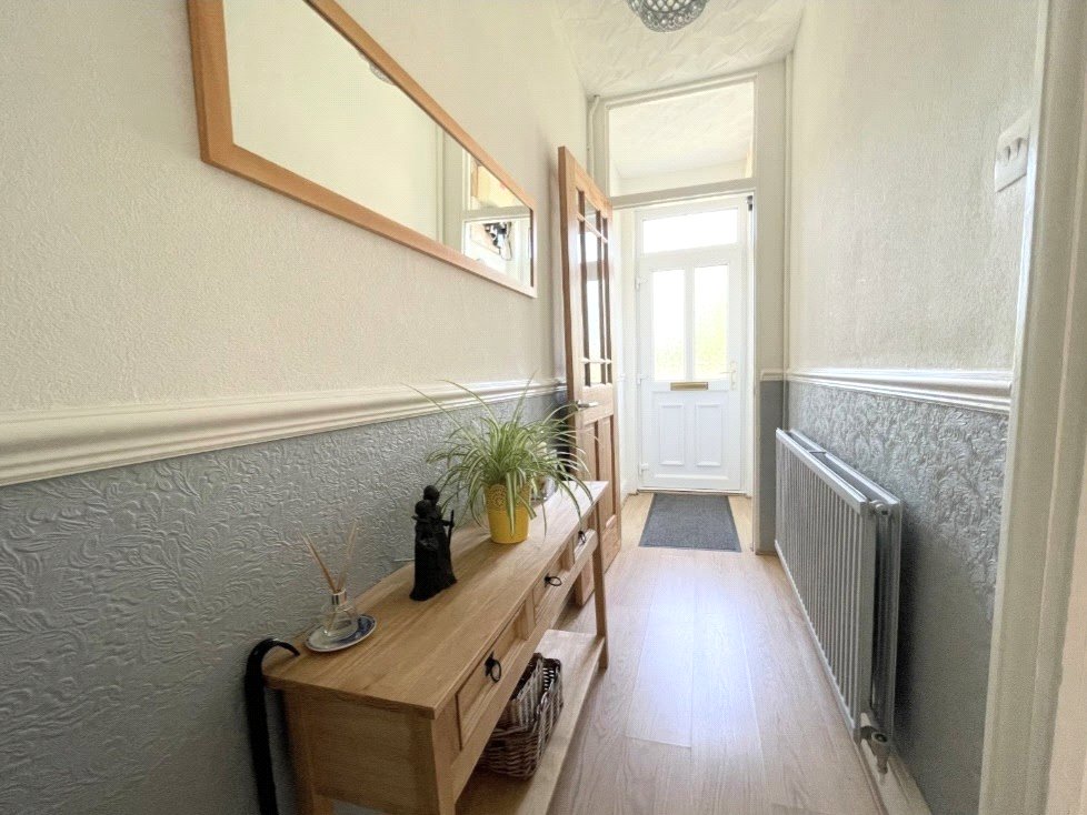 Laminate flooring, uPVC double glazed door to front, radiator, stairs to first floor.