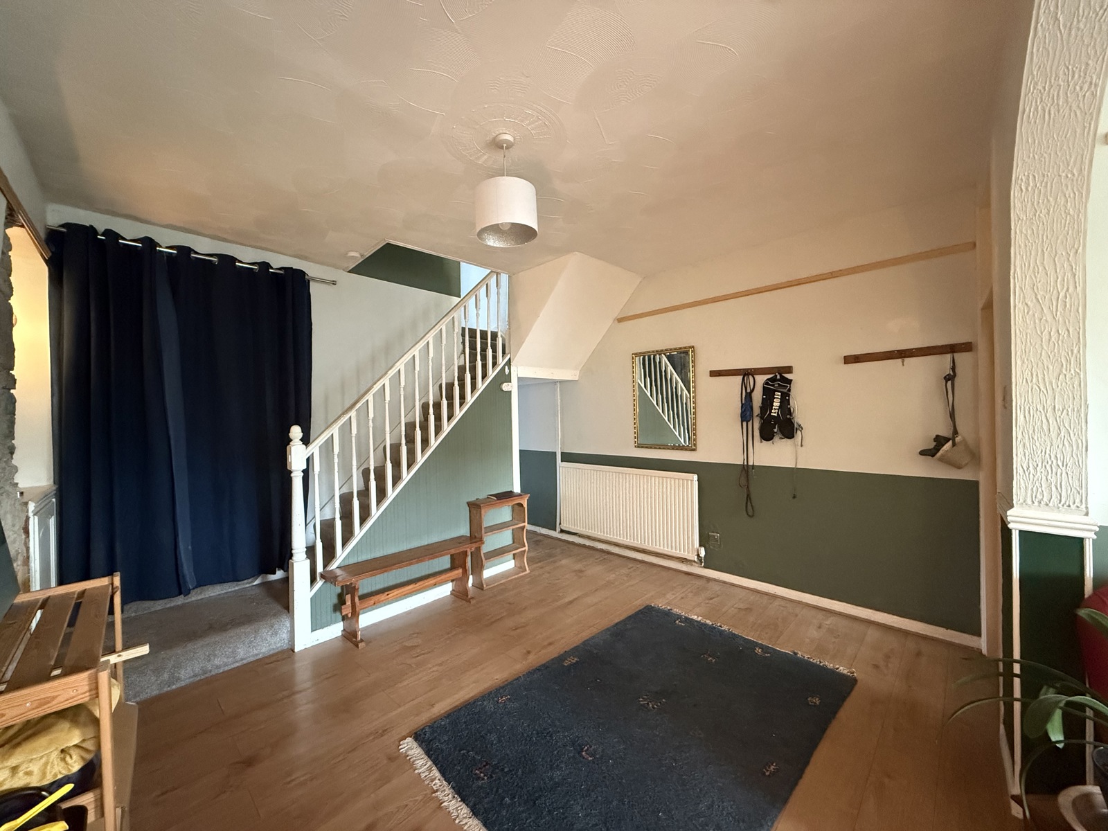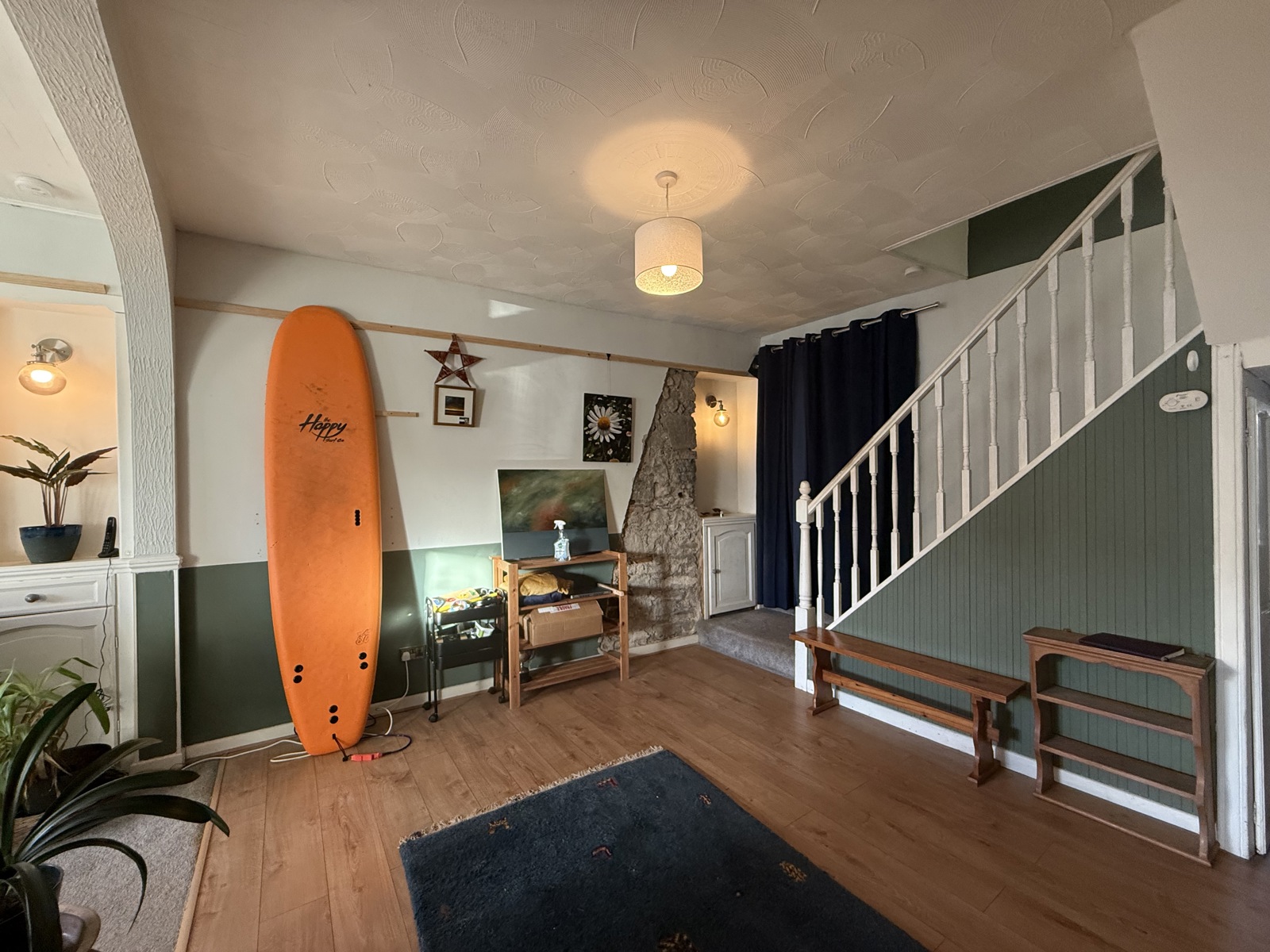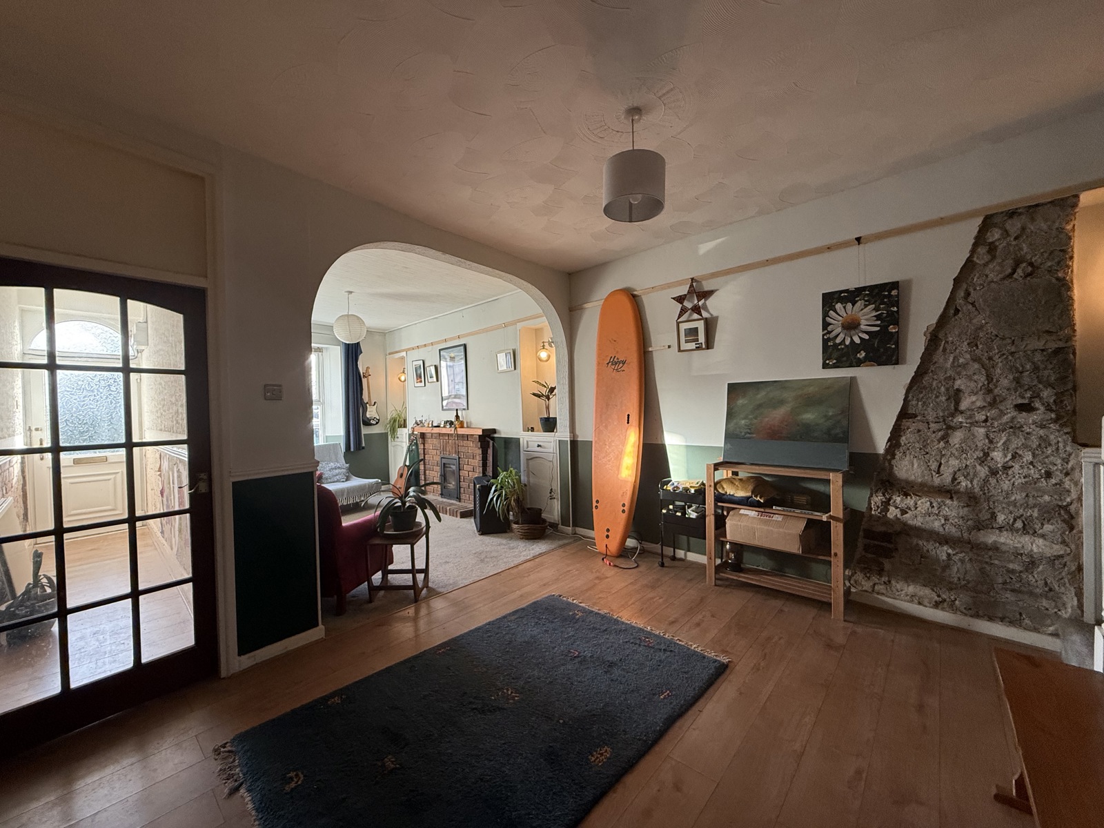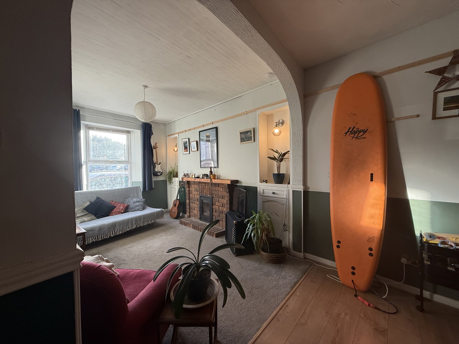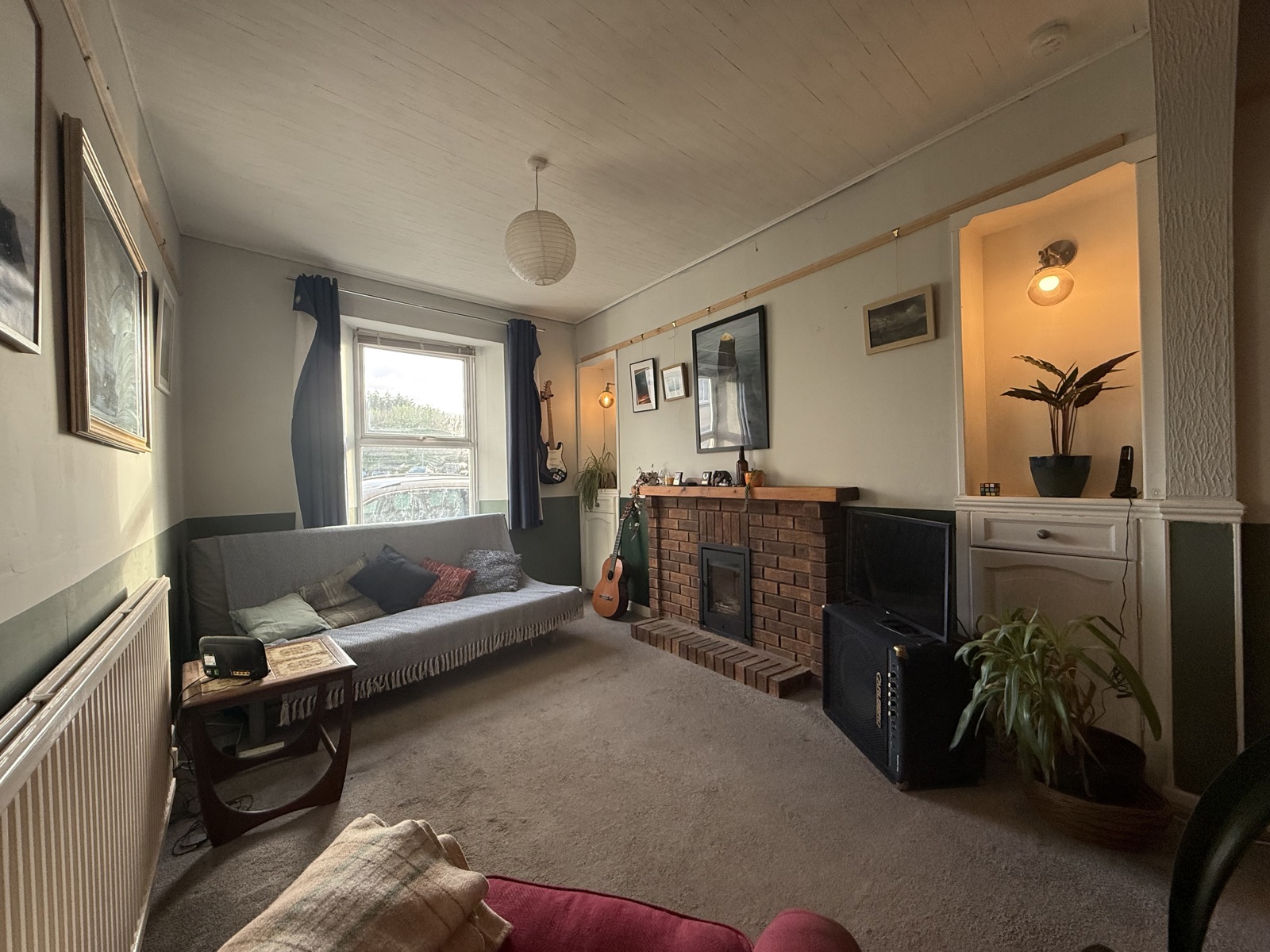 A warm and inviting living room with a generous layout, soft natural light and a charming feature log burner. The combination of painted walls, timber detailing and a gently vaulted ceiling creates a cosy, characterful space ideal for everyday relaxation.