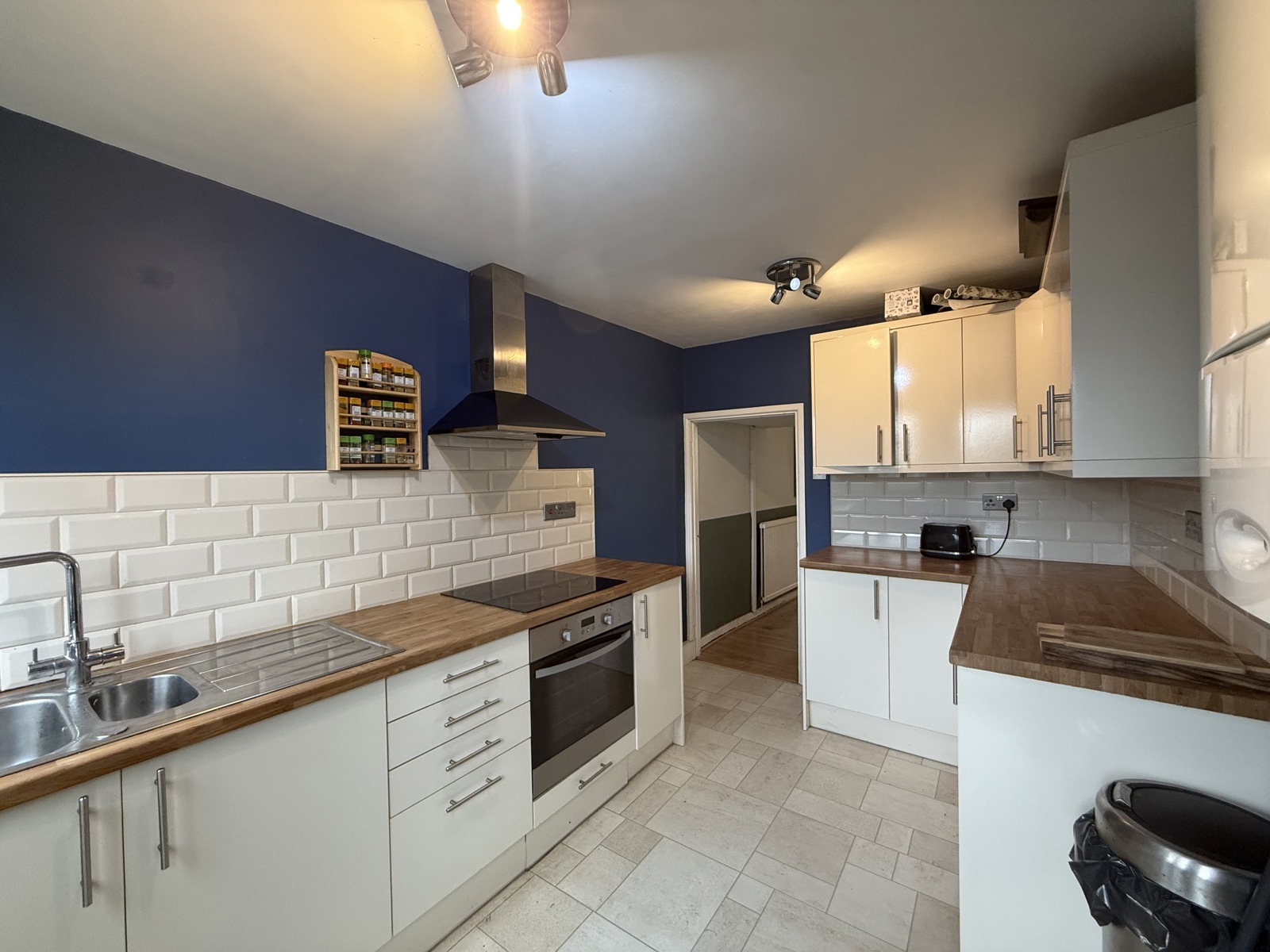 A modern, well presented kitchen with a bright, clean layout and excellent workspace. The combination of white cabinetry, tiled flooring and bold wall colour creates a fresh, contemporary feel, while the practical design makes it ideal for everyday cooking.