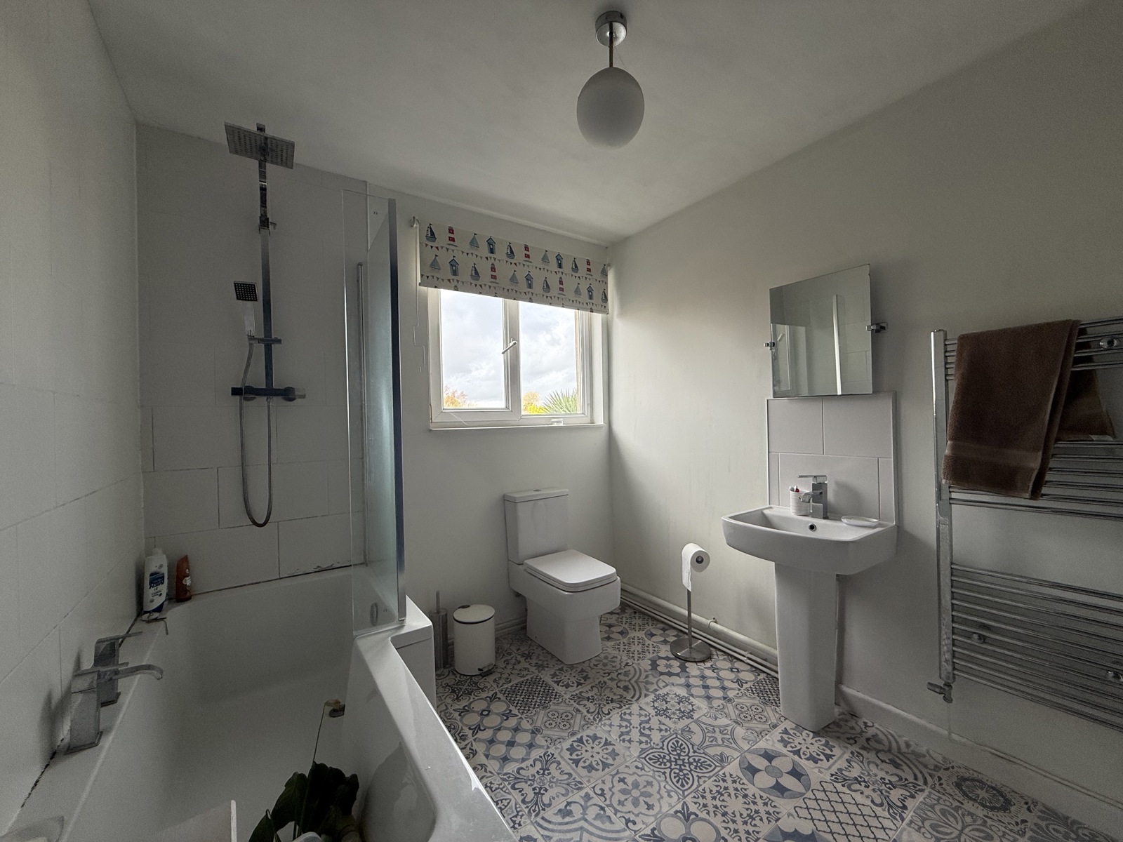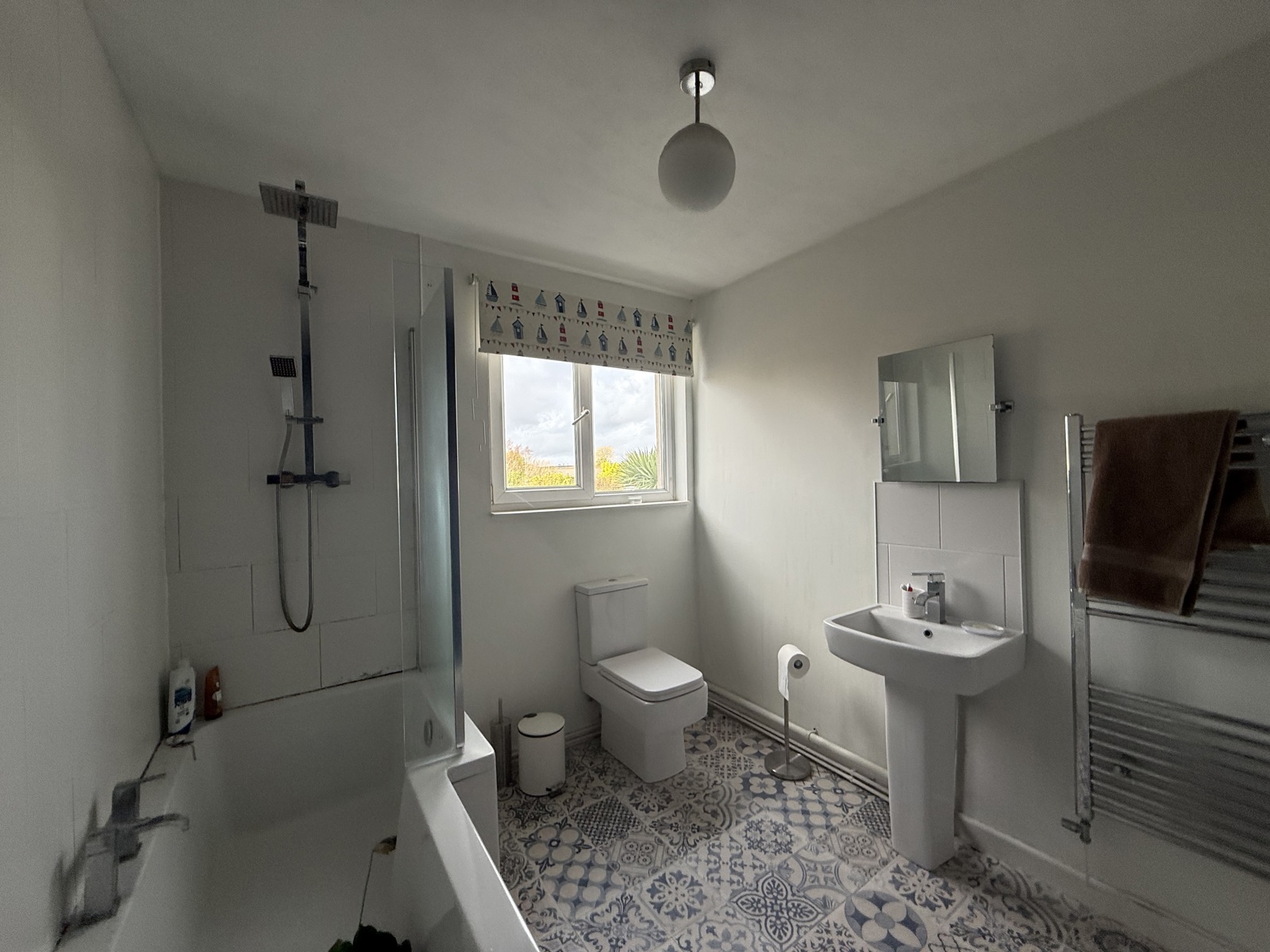 A bright, modern bathroom with a clean layout, featuring a bath with overhead shower, WC and basin. Natural light and patterned flooring give the space a fresh, inviting feel