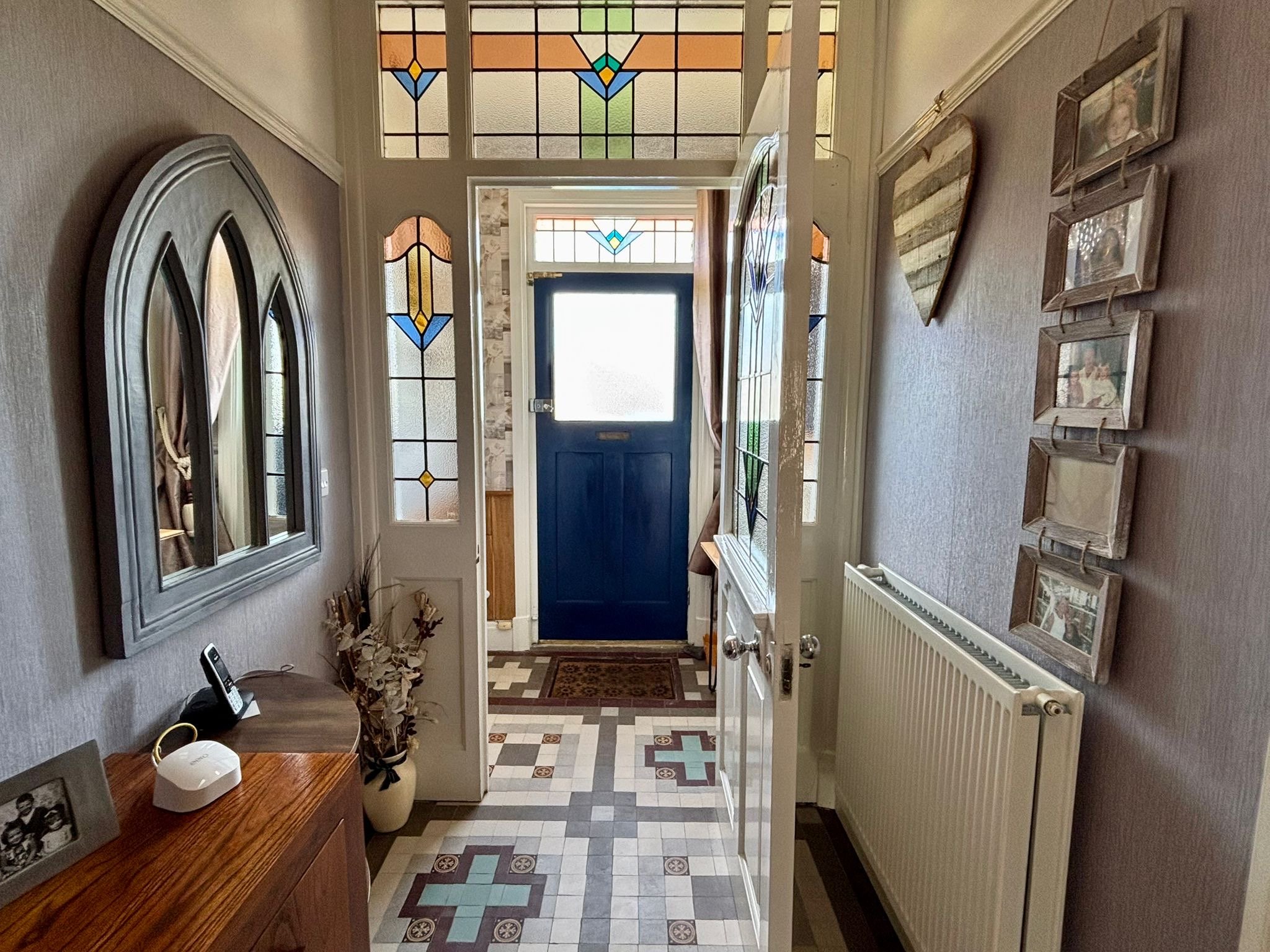 Packed with period features, the property showcases stunning original flooring and internal doors, feature stained-glass double-glazed windows, high ceilings, and tasteful modern updates throughout. The gas central heating ensures comfort all year round.