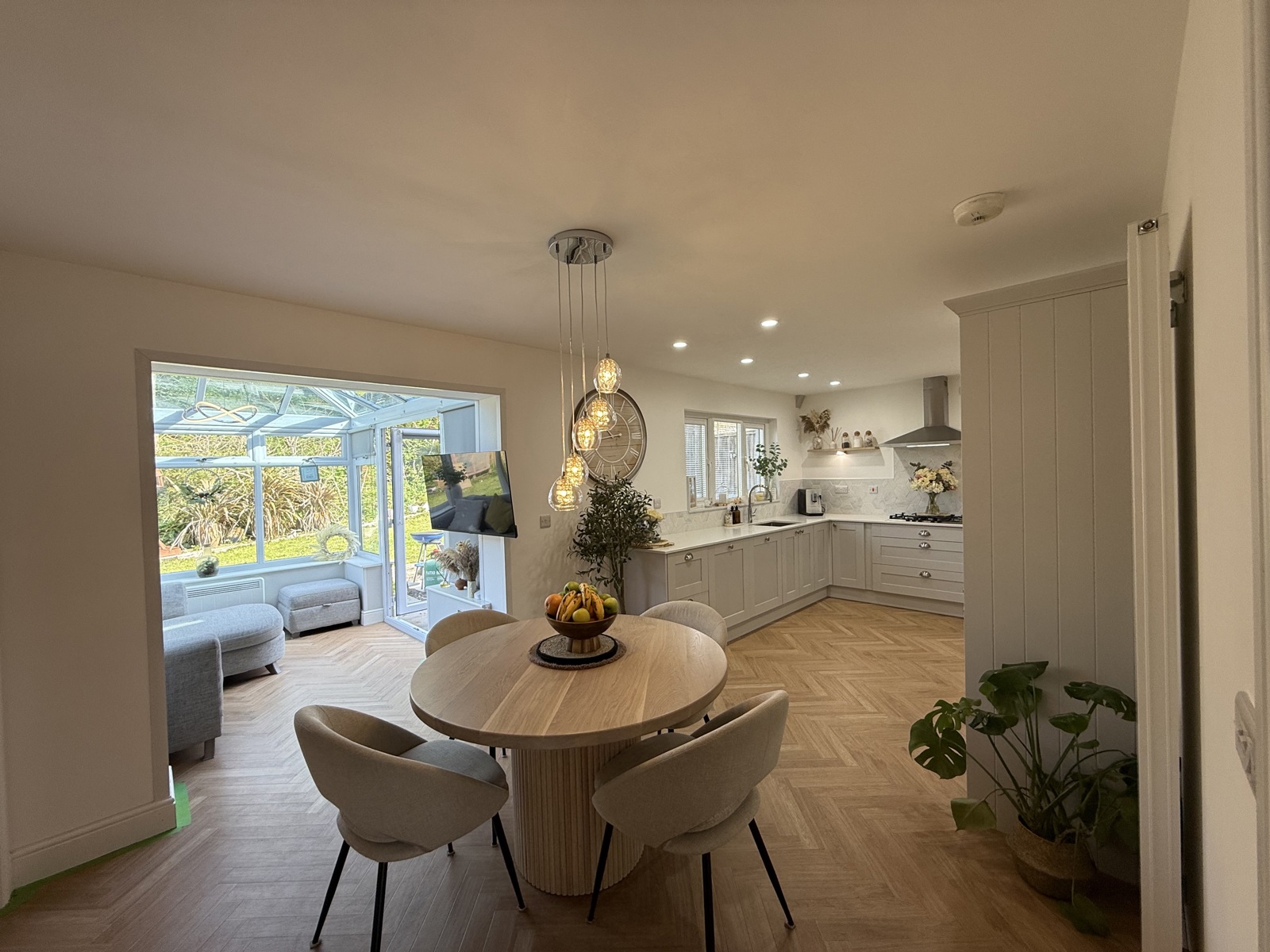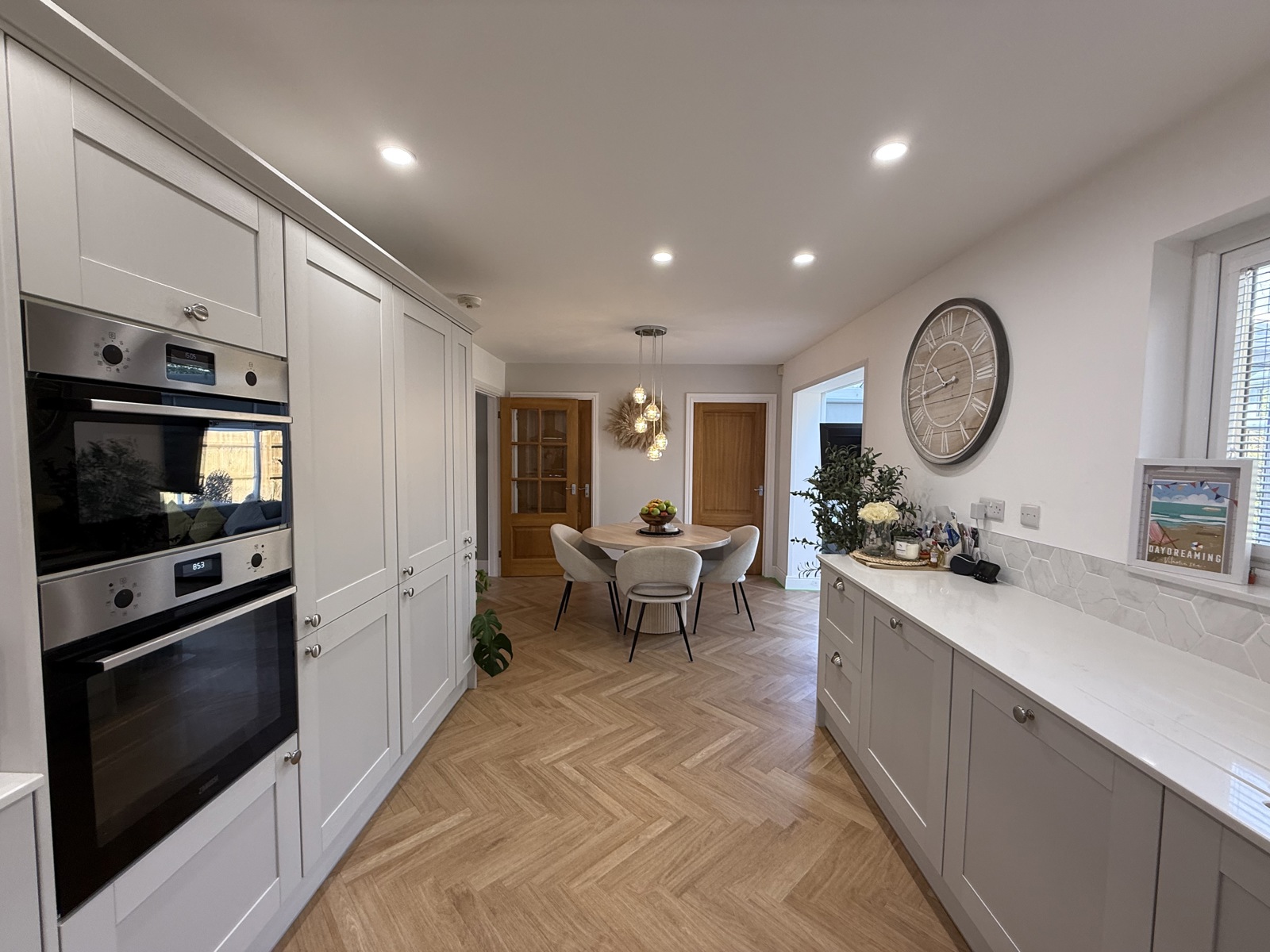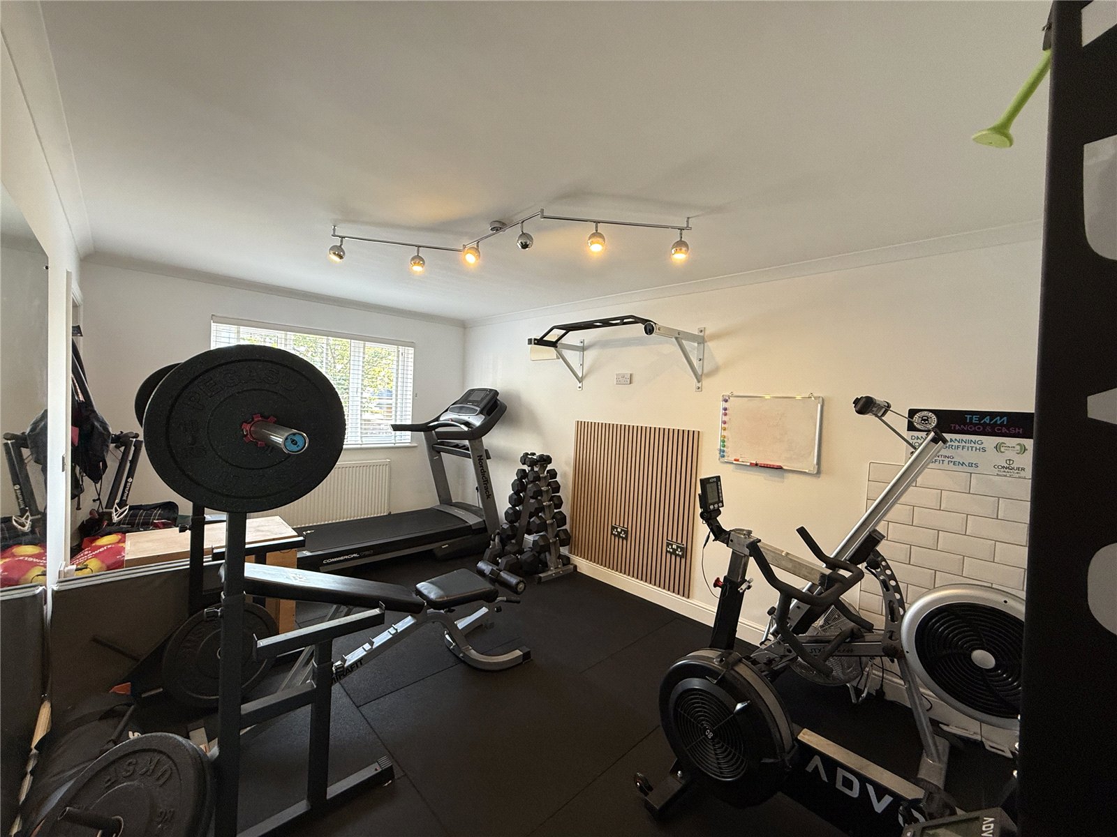 UPVC double glazed window to rear, LVT herringbone flooring, 5 range gas cooker, hexagon tile splashback, integrated dishwasher, integrated, fridge/freezer, integrated oven and microwave, extractor hood above range, quartz worktops, Quooker boiling water mixer tap, radiator, door to gym/dining room, door to utility.