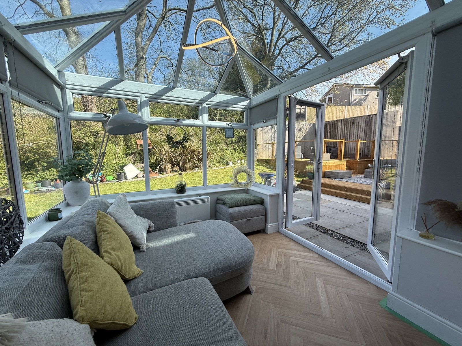 UPVC double glazing, LVT herringbone flooring, French doors leading to garden, electric heater.