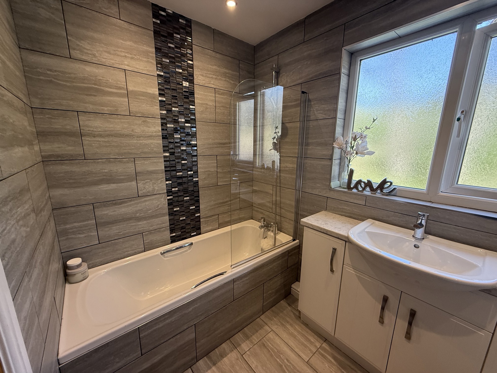 Frosted UPVC double glazed window to rear, shower above bath unit, built in floor cabinets, WC, sink with mixer taps, heated towel rail