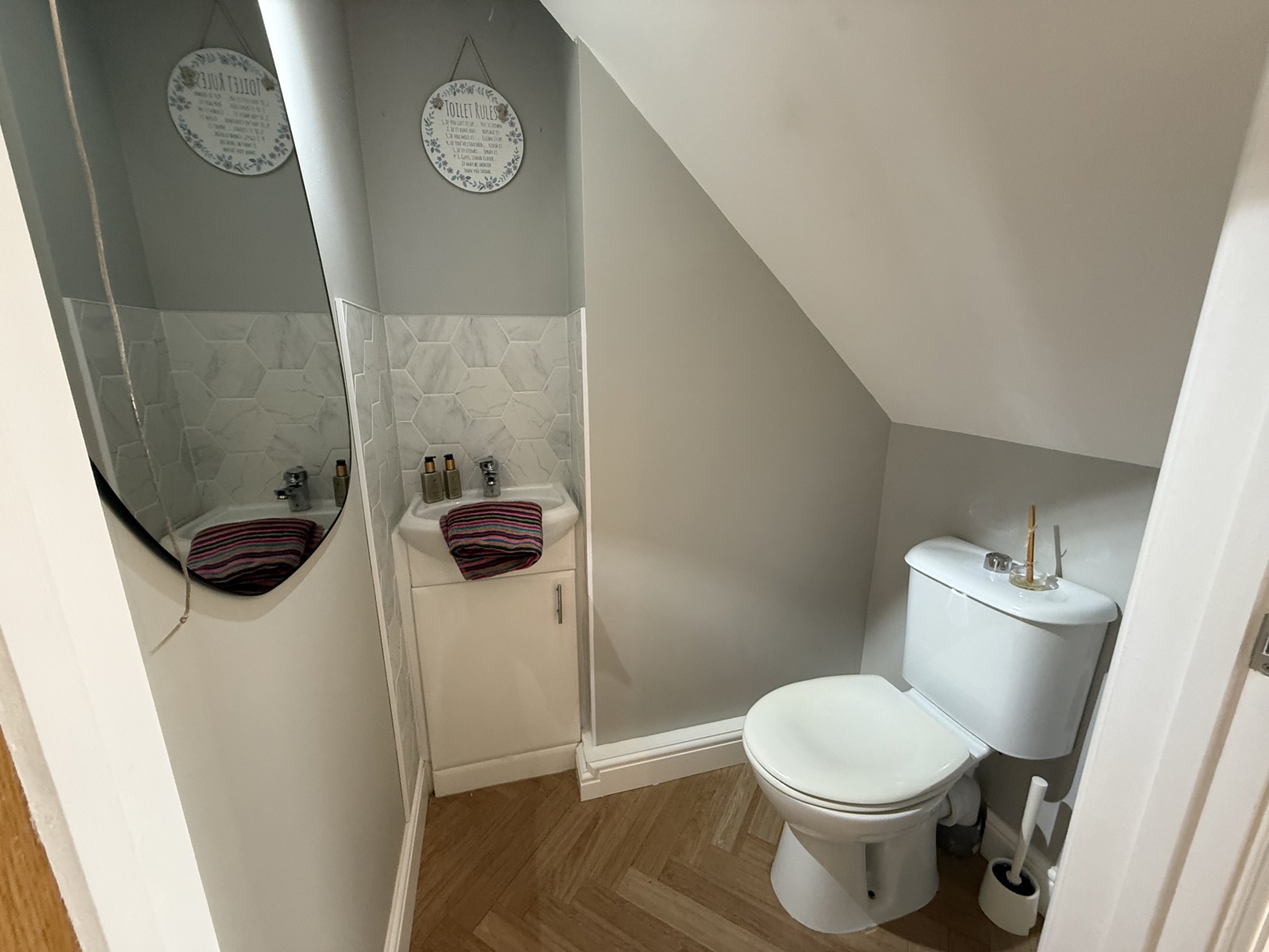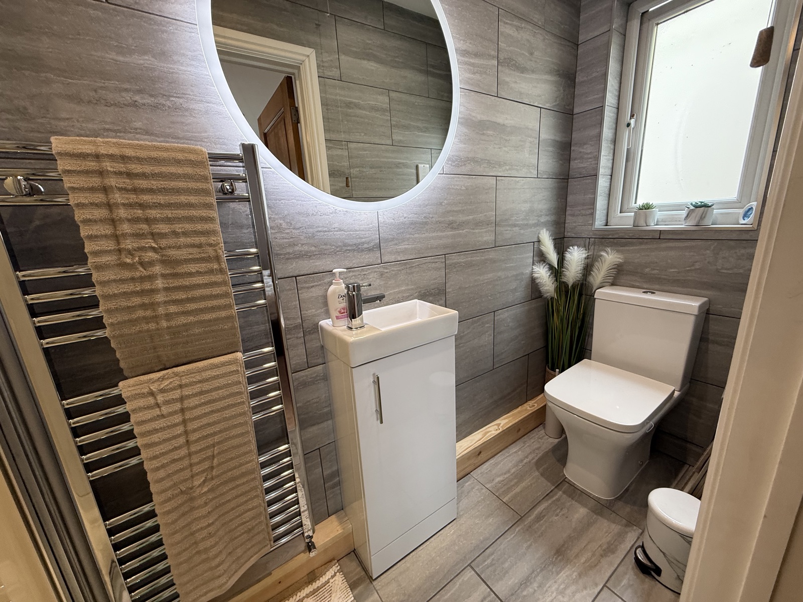 UPVC Frosted double glazed window to side, shower unit, heated towel rail, WC, sink with mixer taps, vanity.