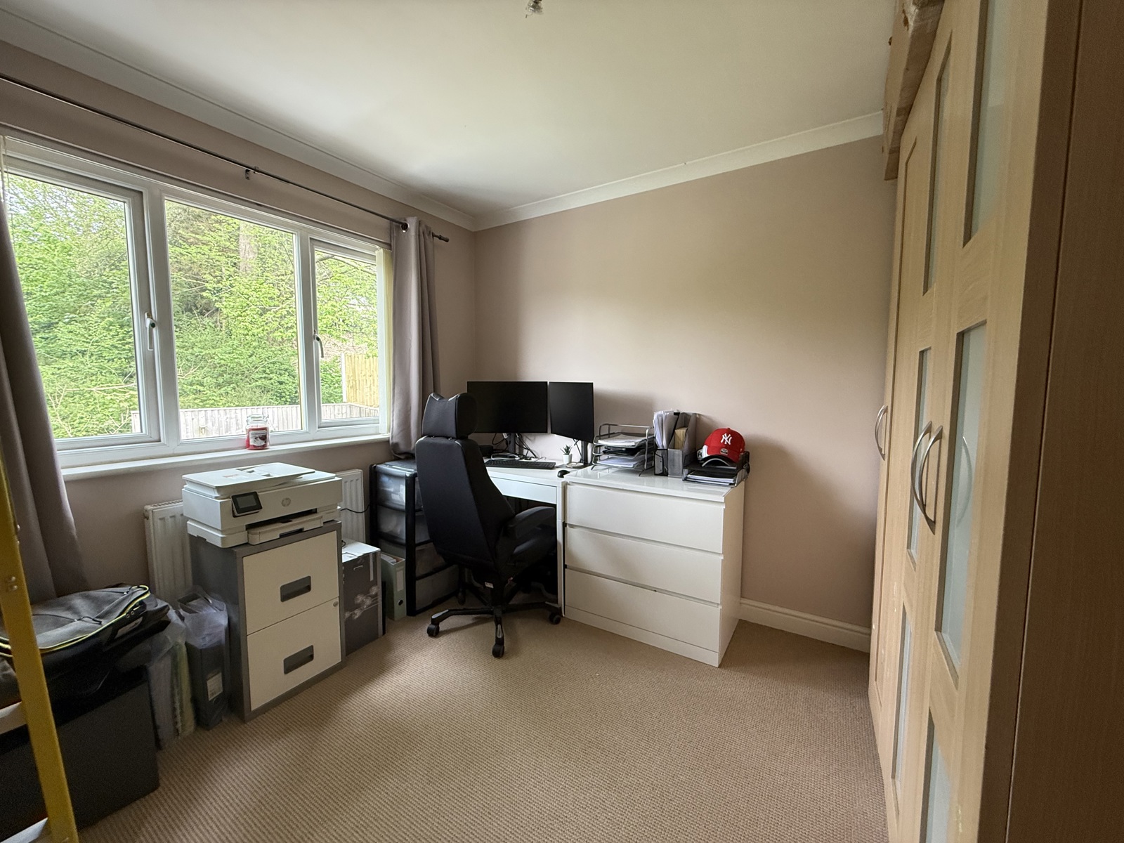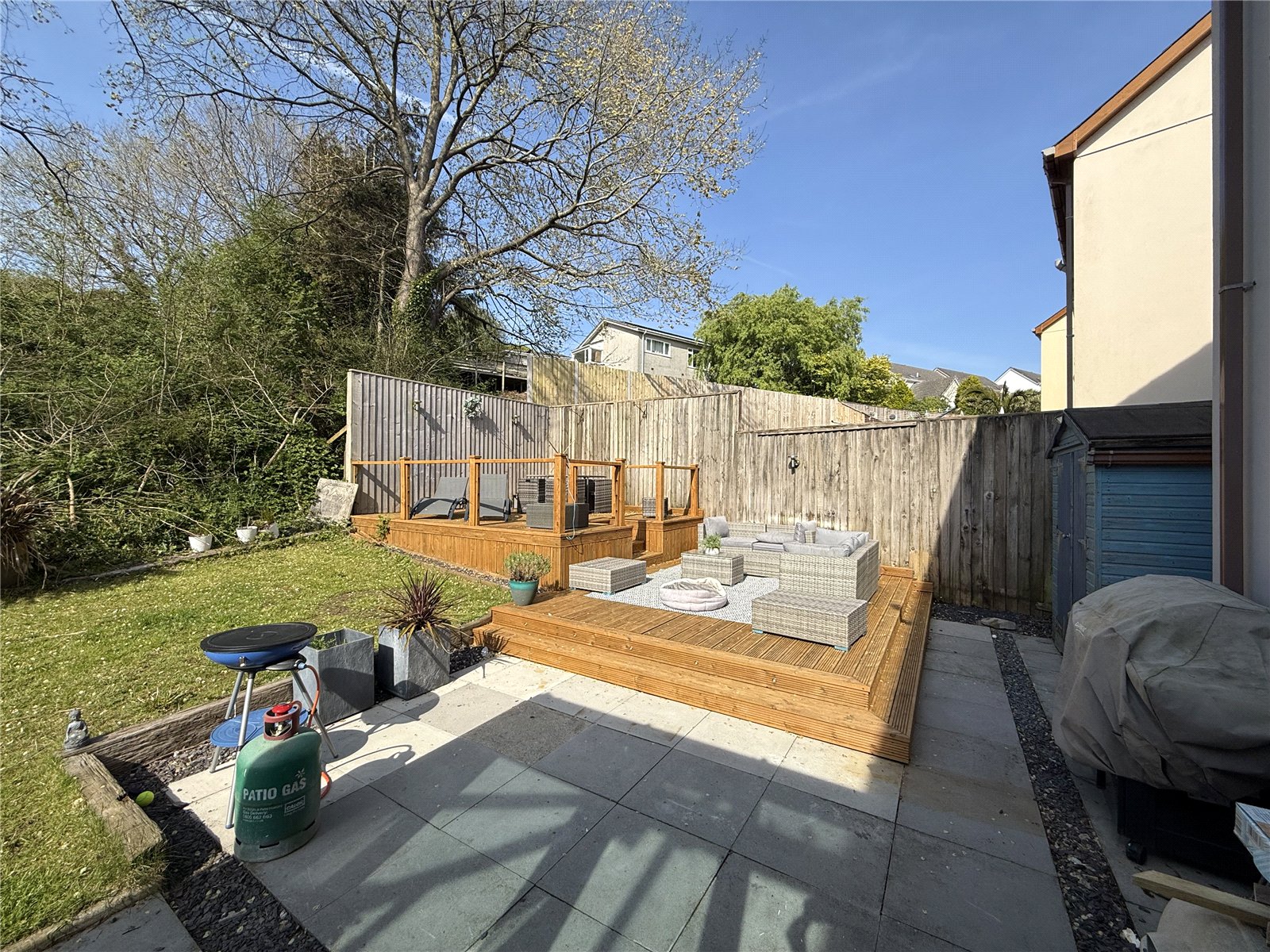 Large paved drive way suitable for 2/3 cars to the front, storage shed to side, lawned area to rear, decking area to rear.