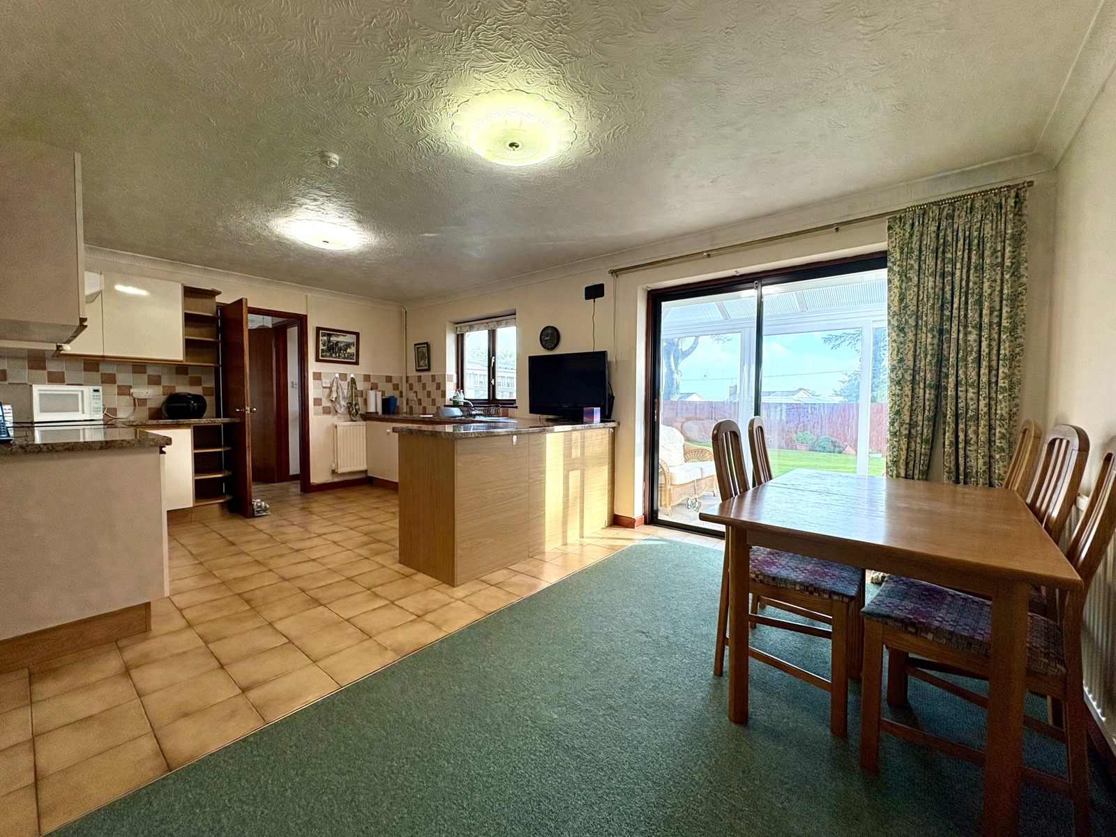 A bright and inviting space featuring carpet flooring and double-glazed uPVC windows to three sides, allowing plenty of natural light. Patio doors open to the rear garden, with convenient access to the adjoining kitchen/dining area.