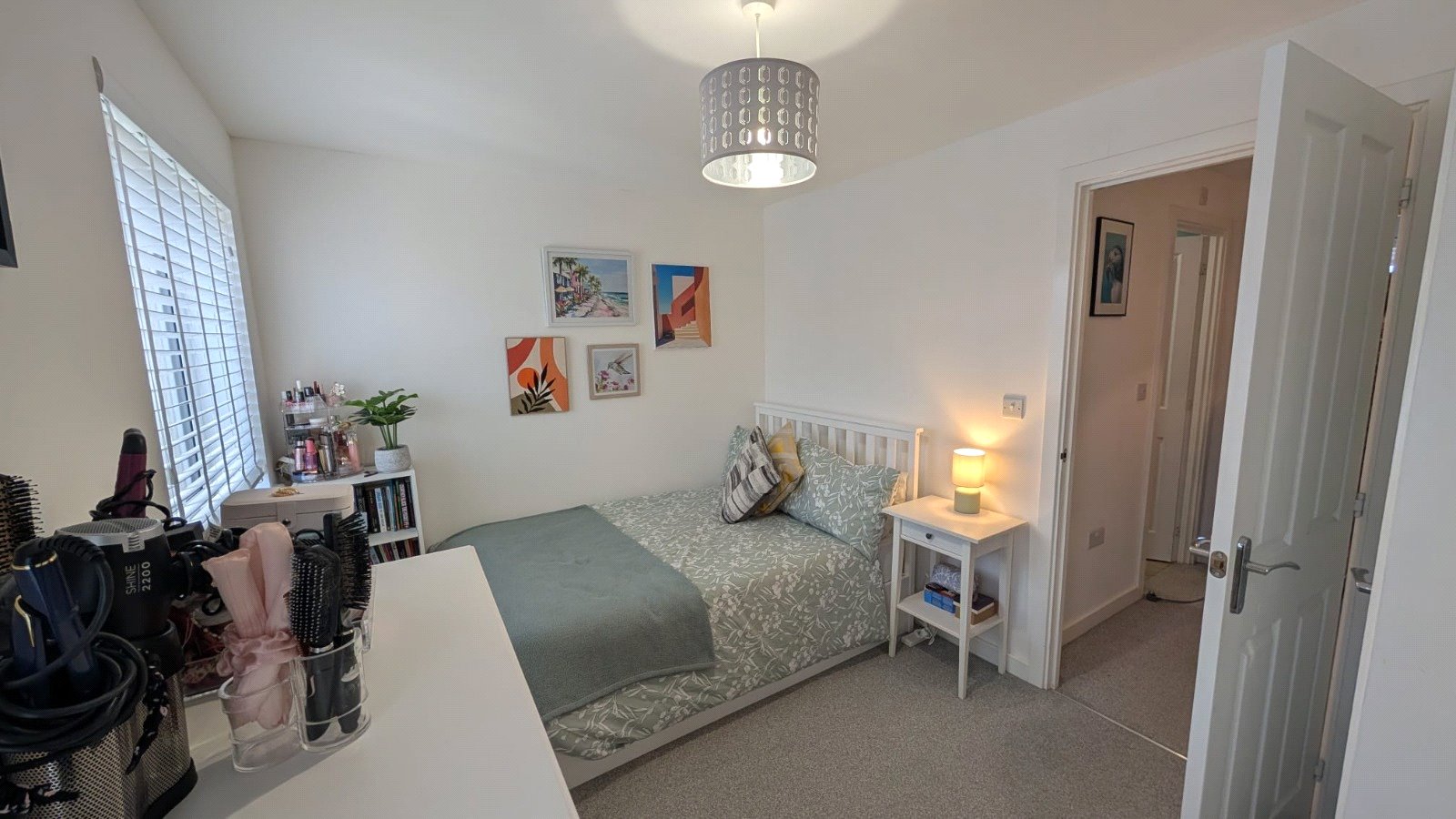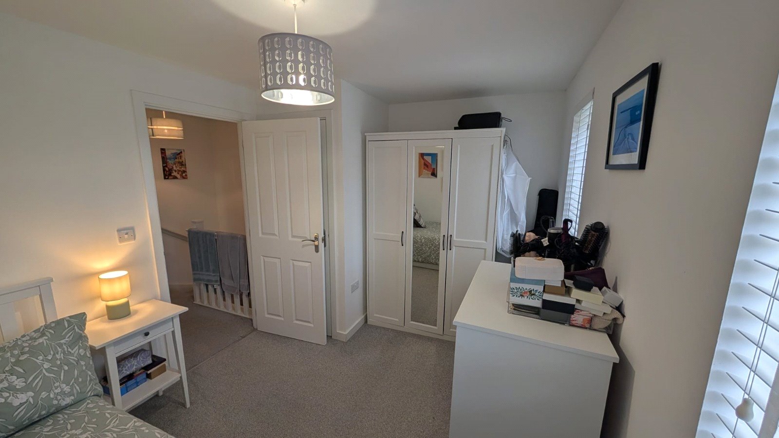 A well-proportioned double bedroom finished in neutral tones, featuring fitted carpet, a radiator, and a double-glazed window. The layout comfortably accommodates a double bed and additional storage, making it ideal as a guest room, home office, or second bedroom.