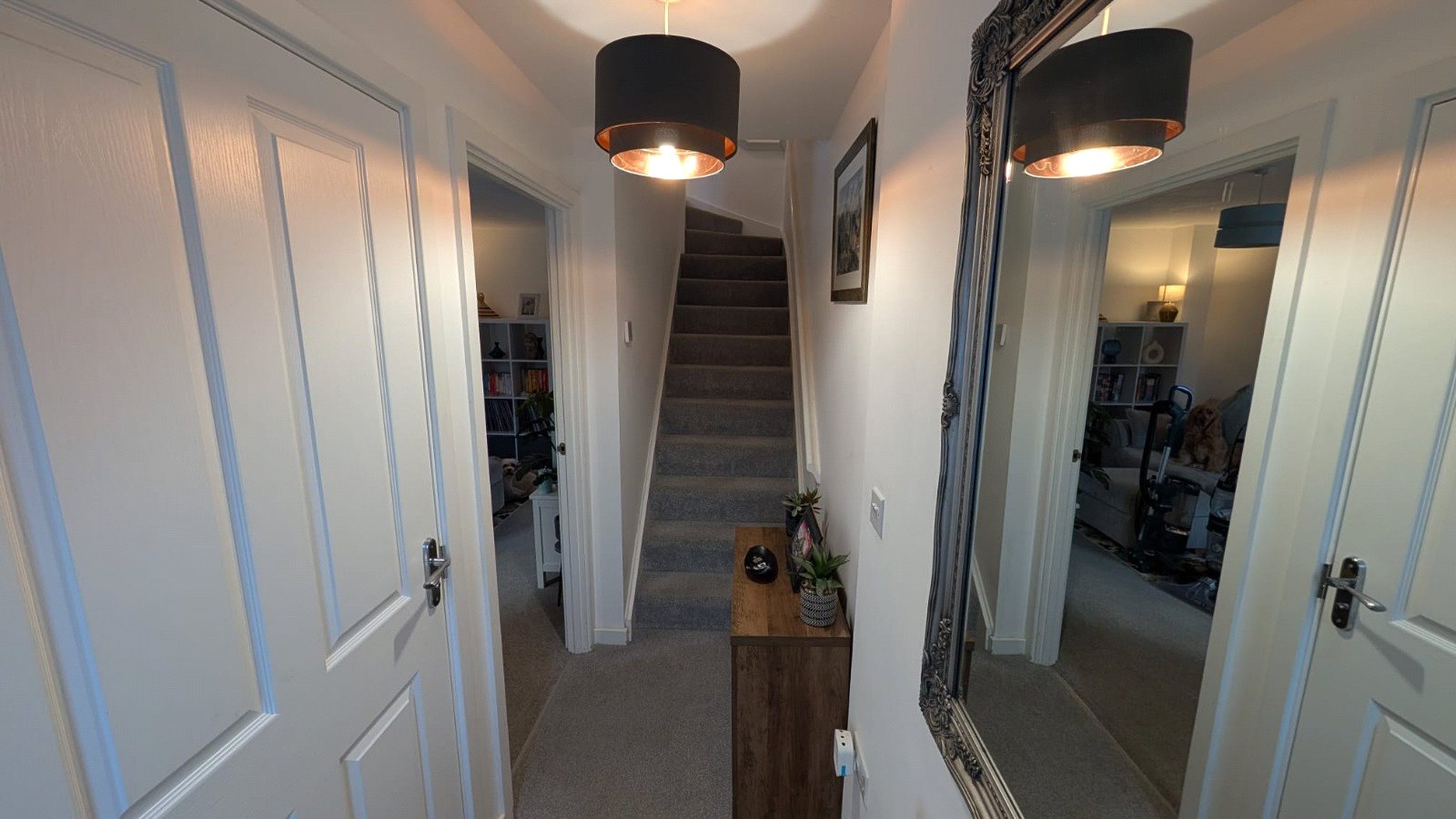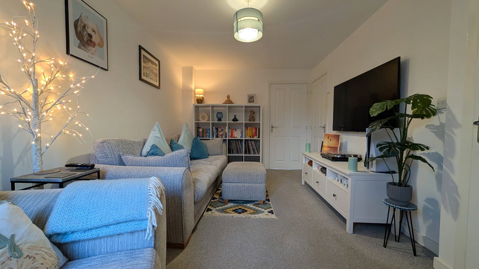 A well-proportioned living room finished in neutral décor, featuring fitted carpet and contemporary lighting. The room flows naturally from the entrance hall and connects through to the kitchen/dining area, with a front-facing window providing good natural light and a pleasant outlook.