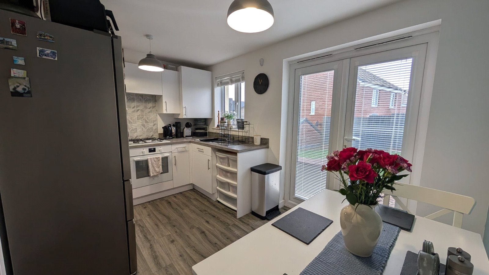 A modern fitted kitchen featuring a range of wall and base units, complementary worktops, and integrated cooking appliances. The space incorporates a defined dining area, wood-effect flooring, and contemporary lighting, with French doors flooding the room with natural light and providing direct access to the rear garden.