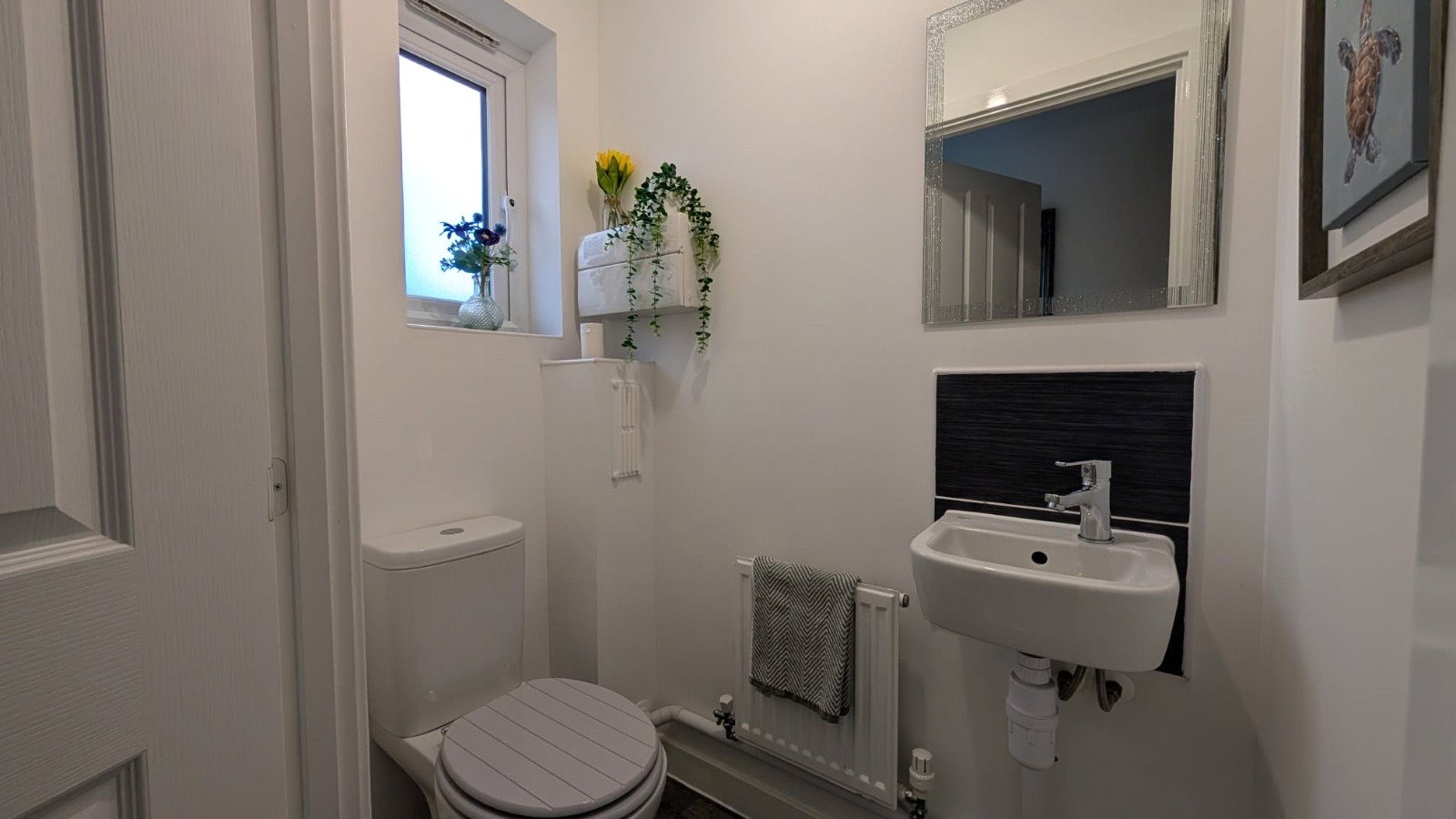 A convenient ground floor cloakroom fitted with a modern white suite and wall-mounted wash hand basin. The room benefits from a window providing natural light and ventilation, making it a practical addition to the ground floor layout.