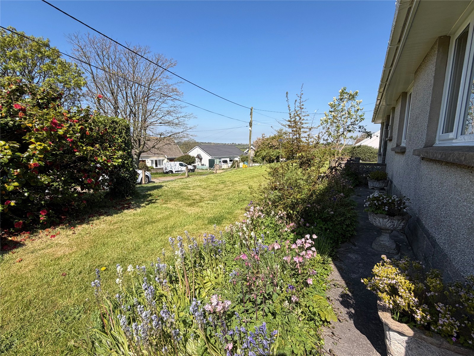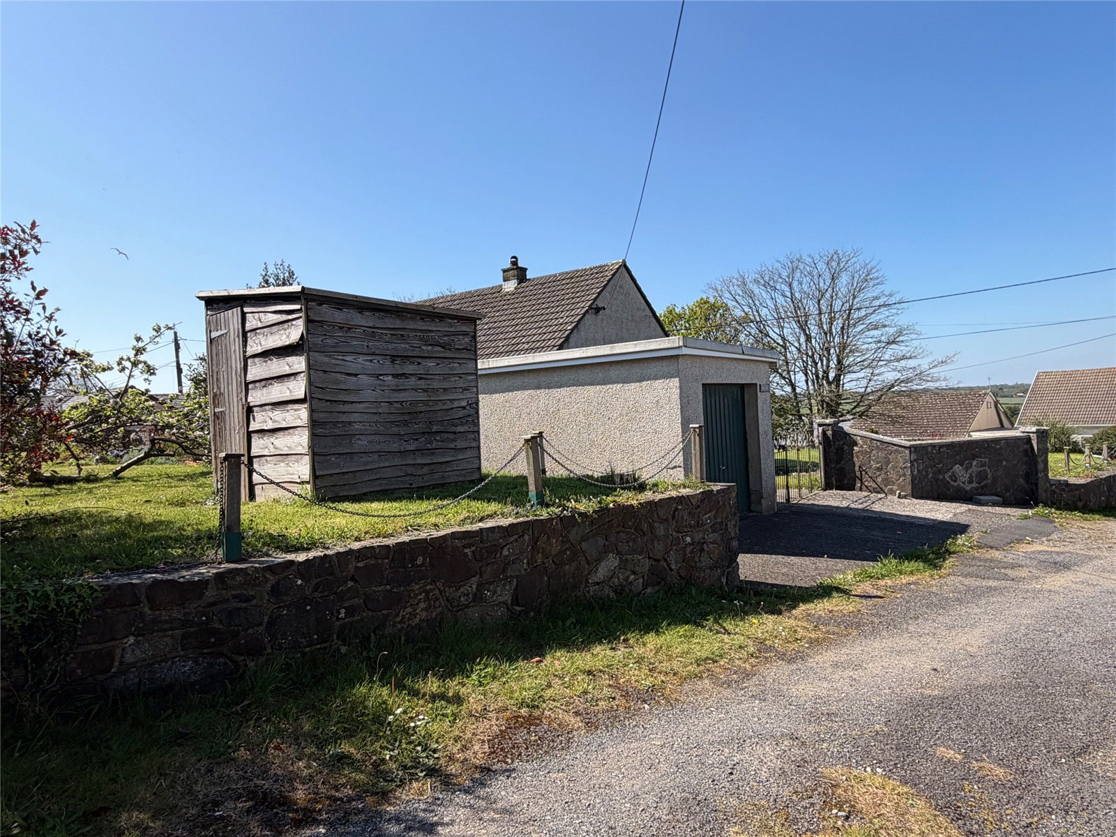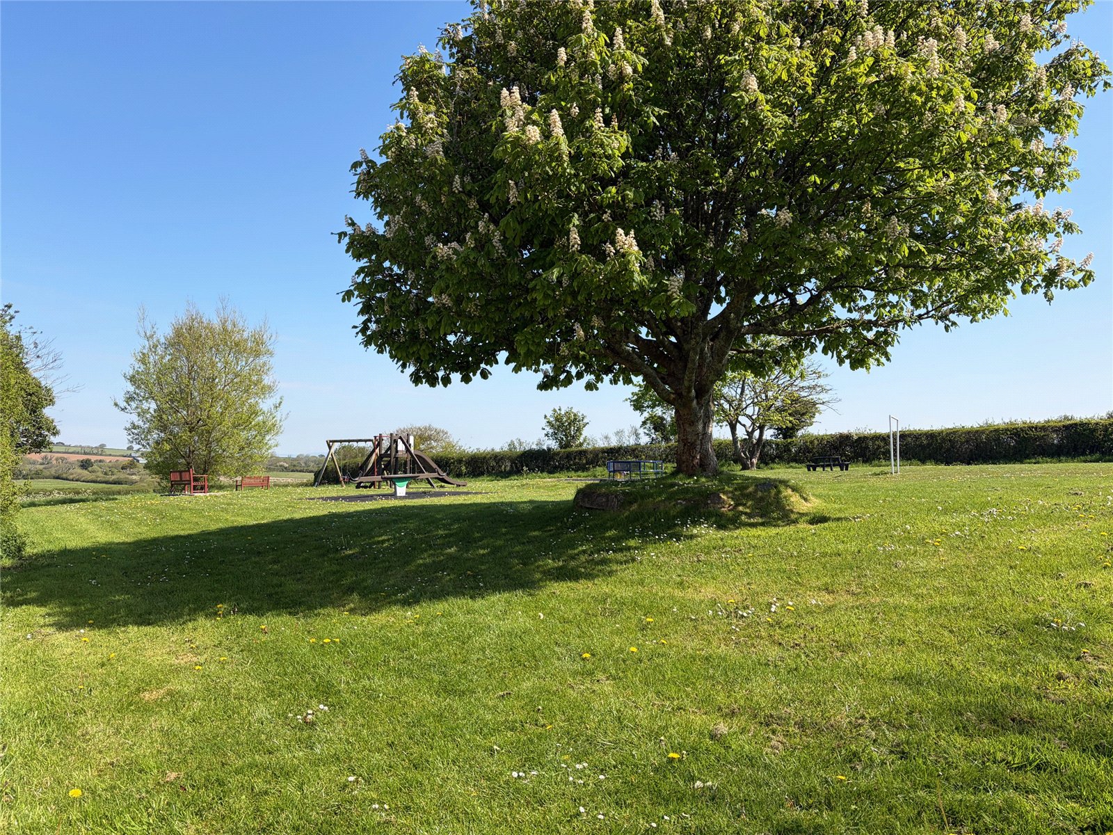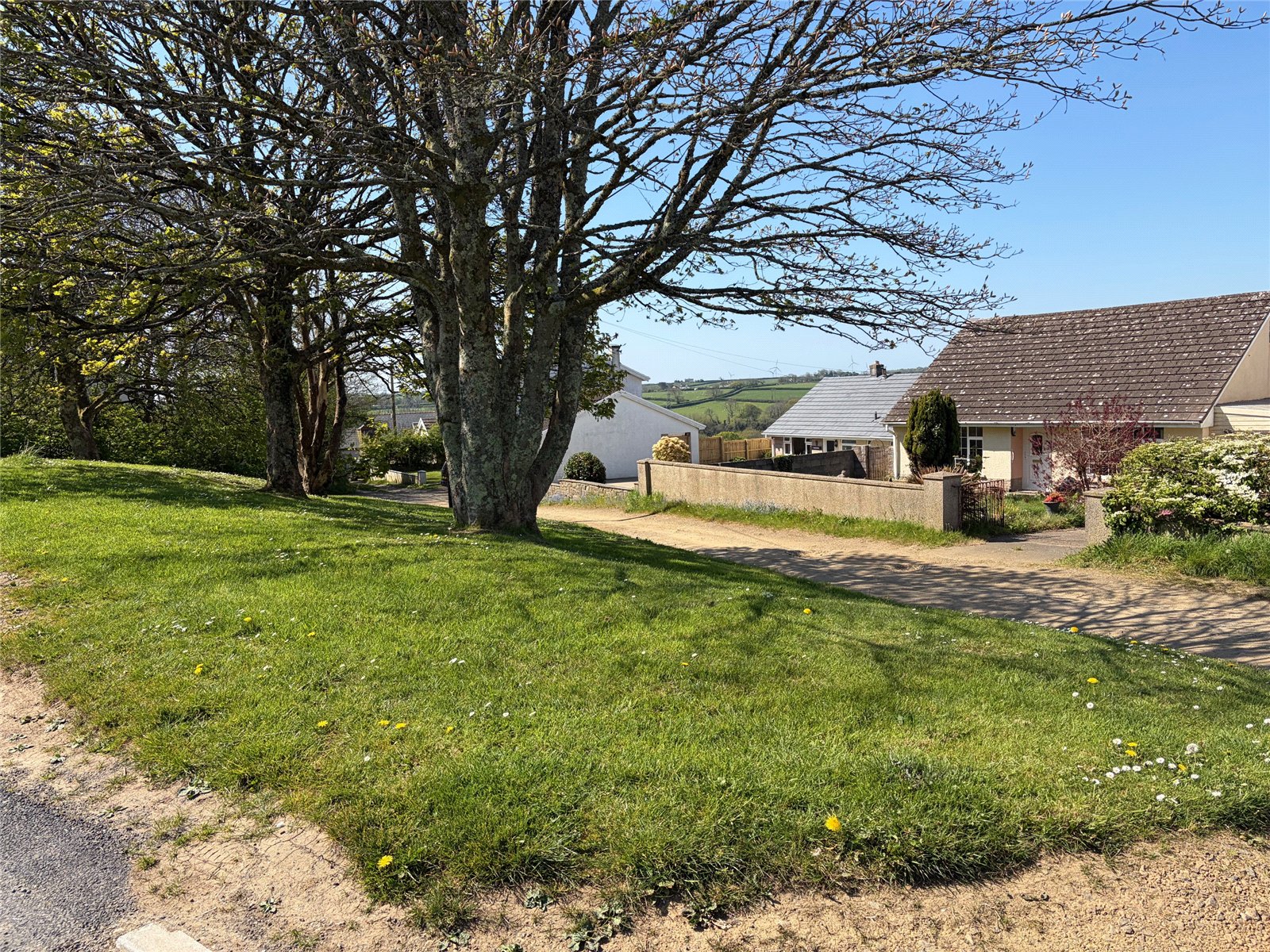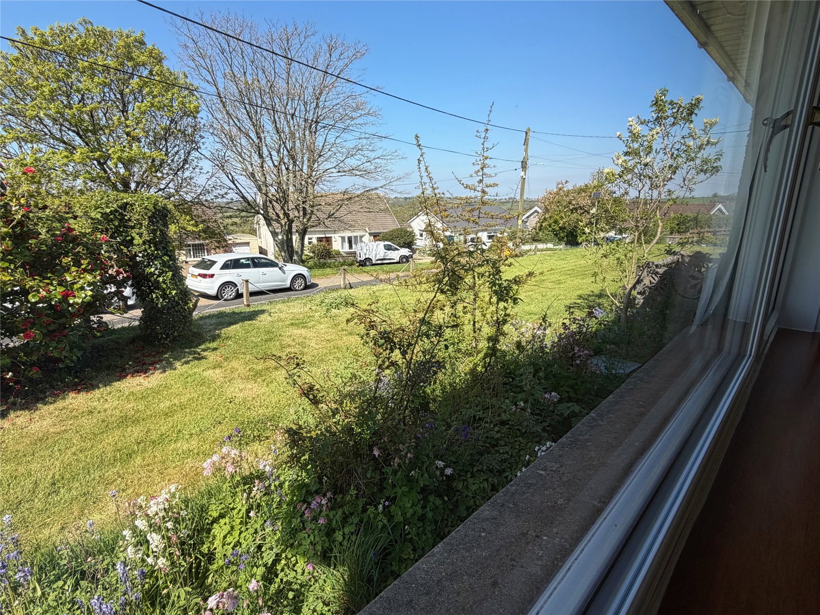 Set on a generous plot, the property benefits from a private driveway, a detached garage, and well-established front and rear gardens featuring mature planting, shrubs, and hedging. To the front, the property enjoys attractive countryside views, while to the rear there is an enclosed, large grassed garden with colourful plants and trees. To the top of the external lane you will find a family-friendly playing field complete with play park, football goals, and basketball hoops—making it an excellent choice for families.