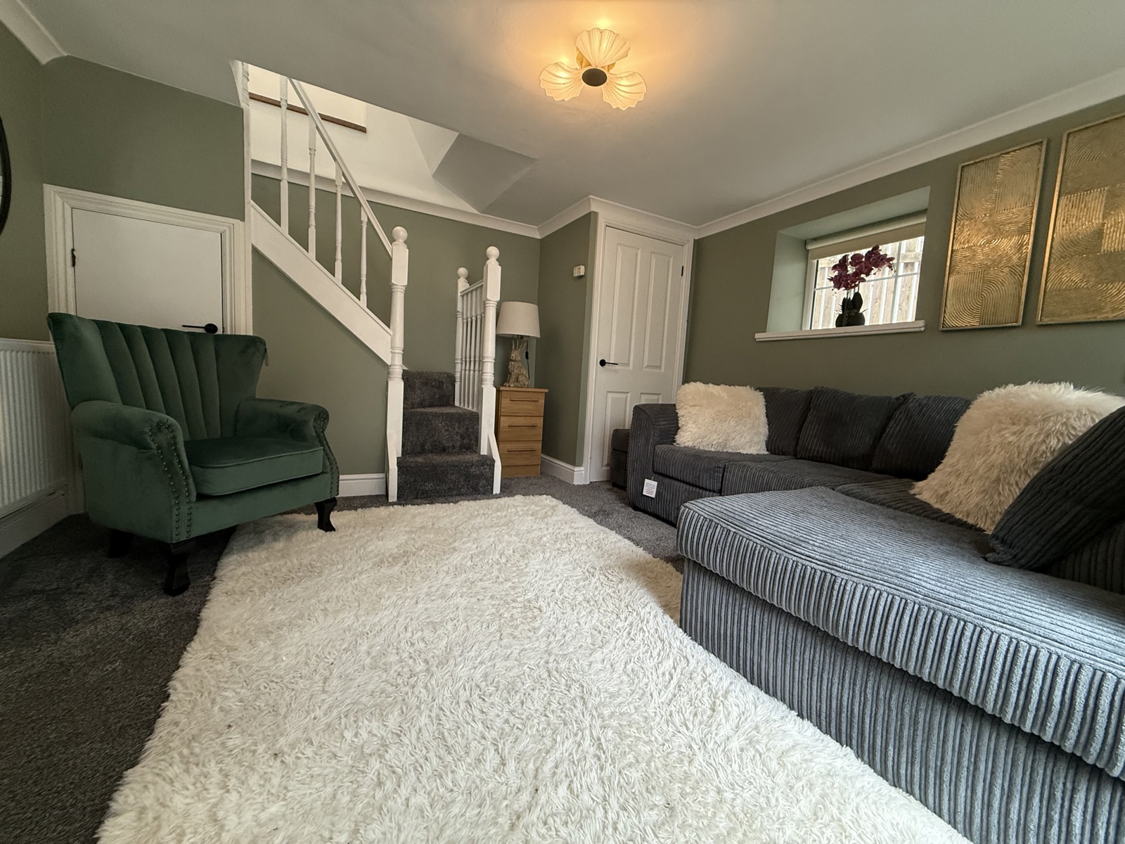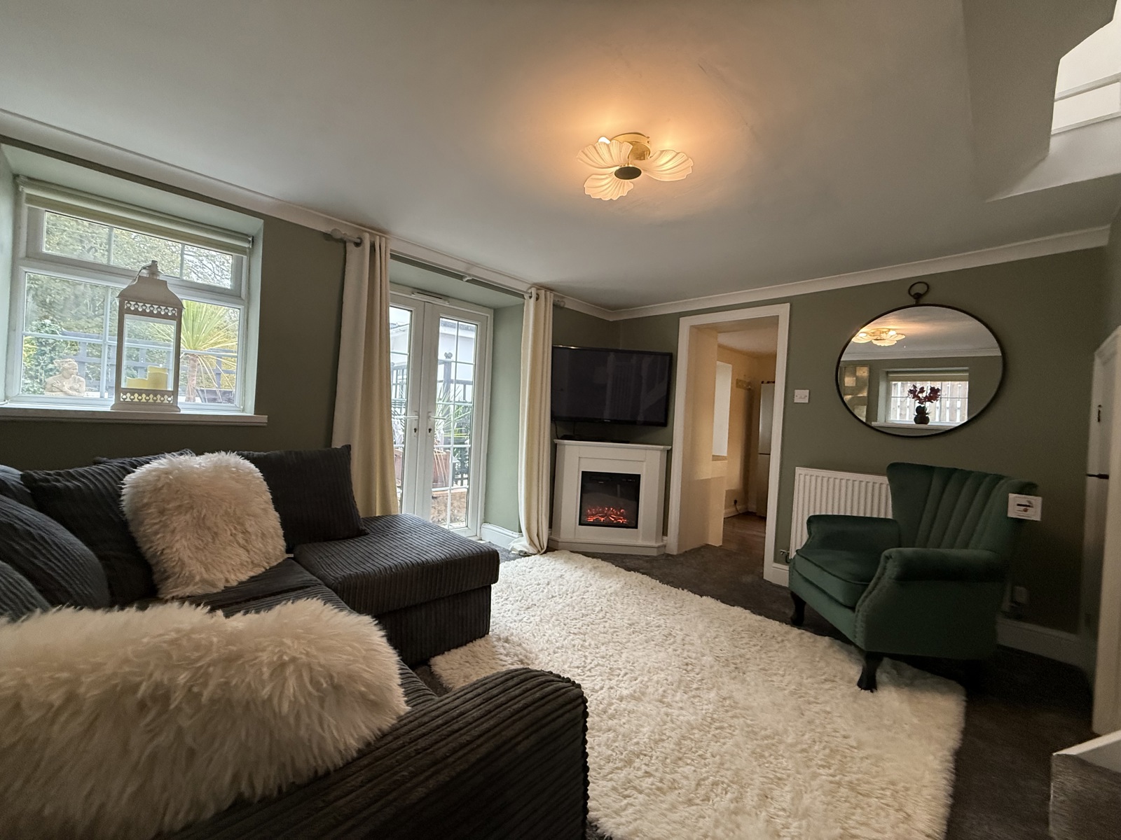 French doors, dual aspect windows, understairs storage cupboard, secondary storage cupboard, electric decorative fire, grey carpet, radiator and pendant light.