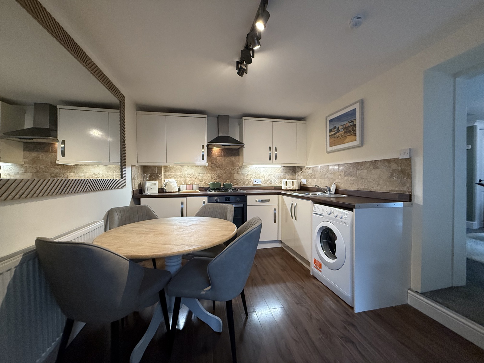 UPVC door leading into the kitchen, wall and base mounted units, stone effect splashback, electric integrated oven, gas hob, extractor fan, space for washing machine and fridge, round sink and drainer.