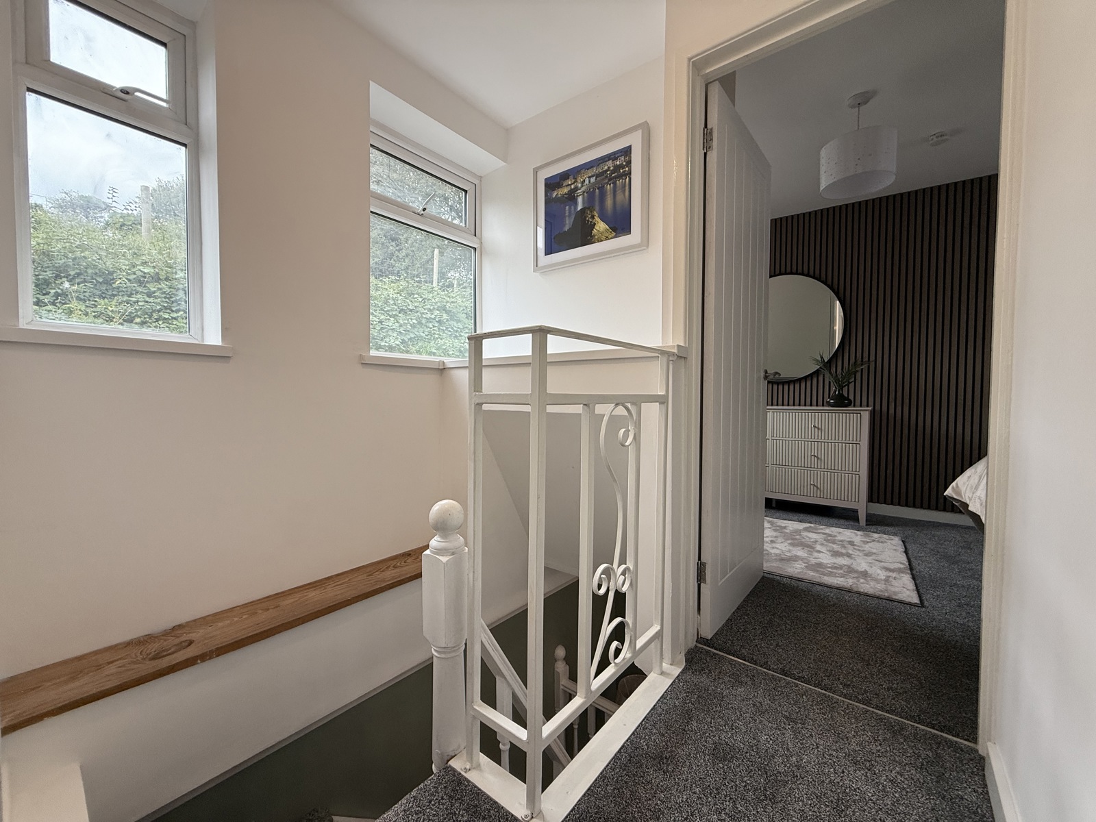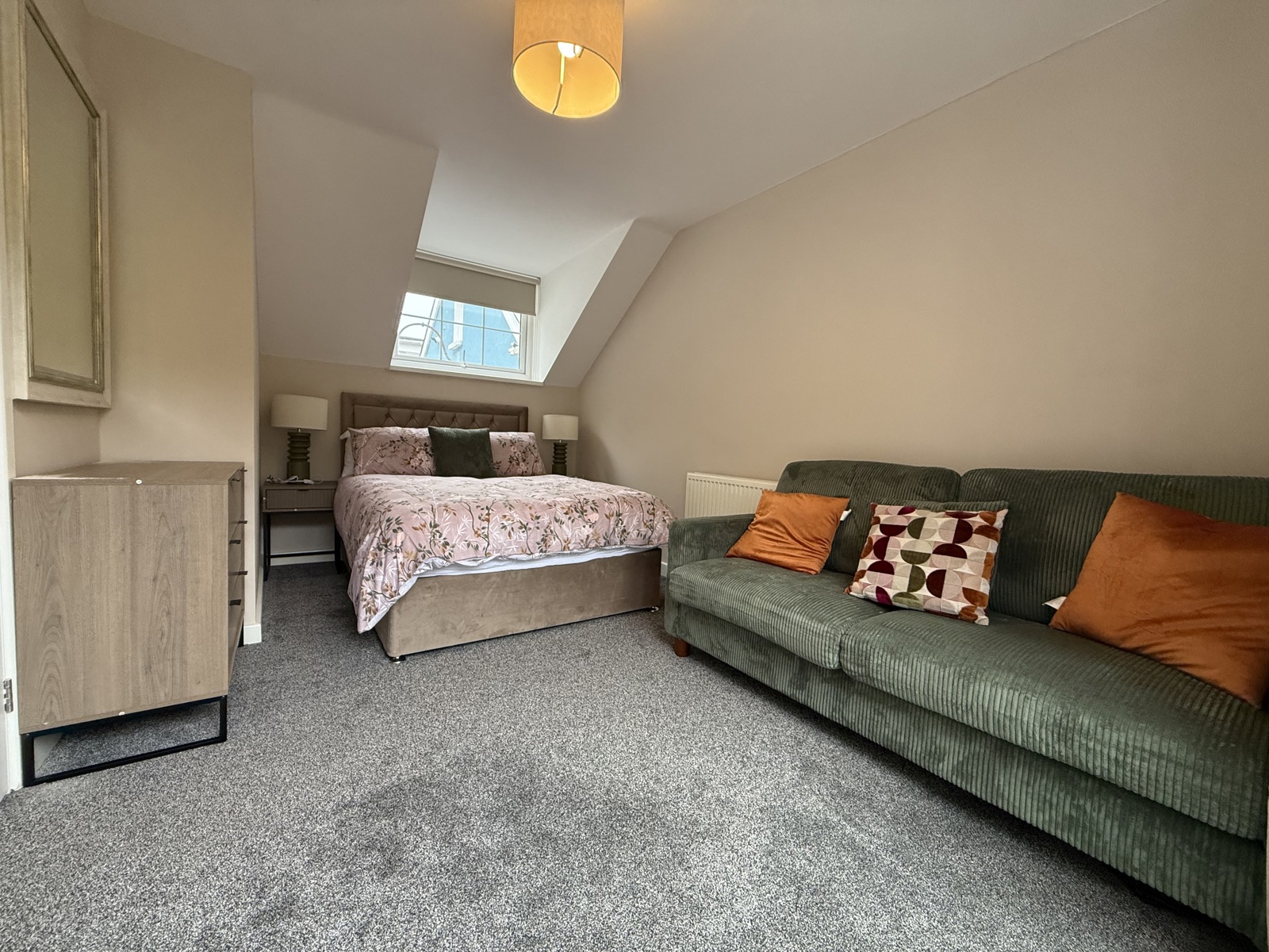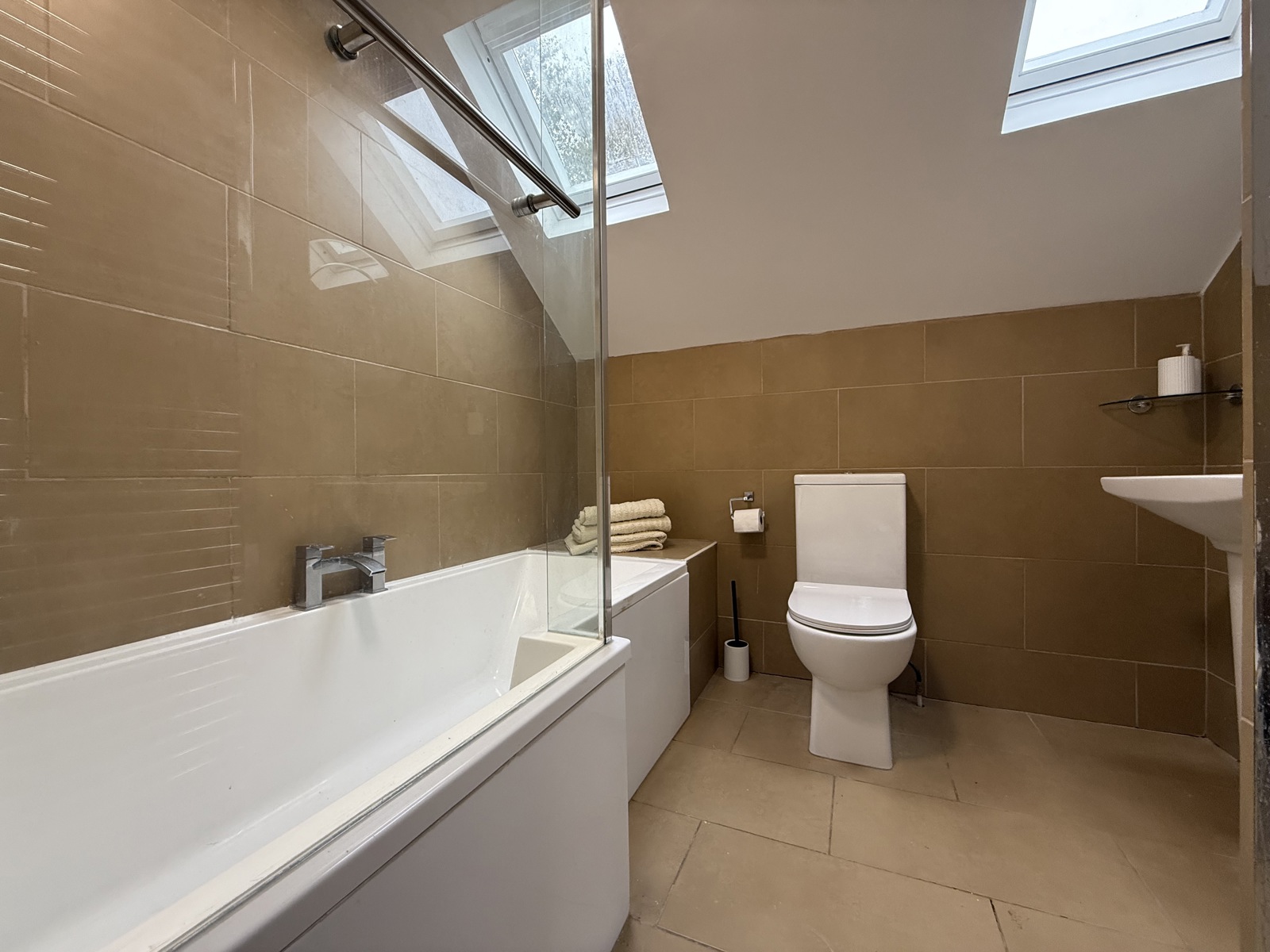 Fully tiled, two Velux windows, L shape bath with over shower and glass screen, WC, wash hand basin, heated towel rail, LED mirror.
