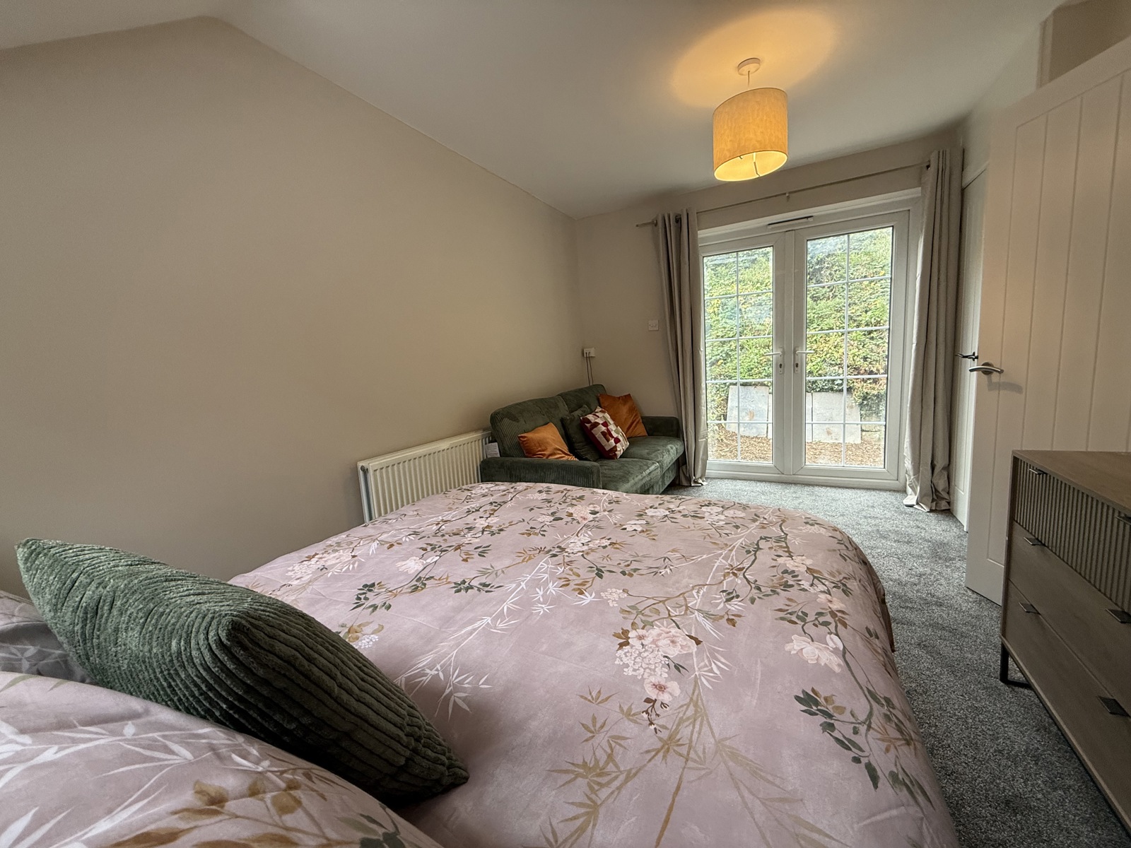 Patio doors leading to rear garden, radiator, built in storage and grey carpet.