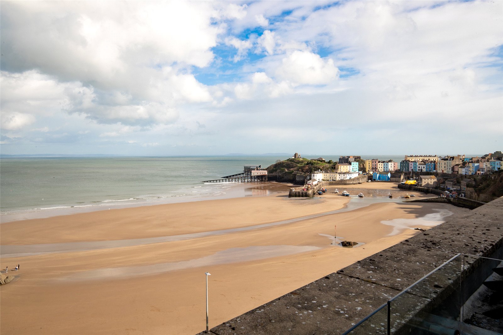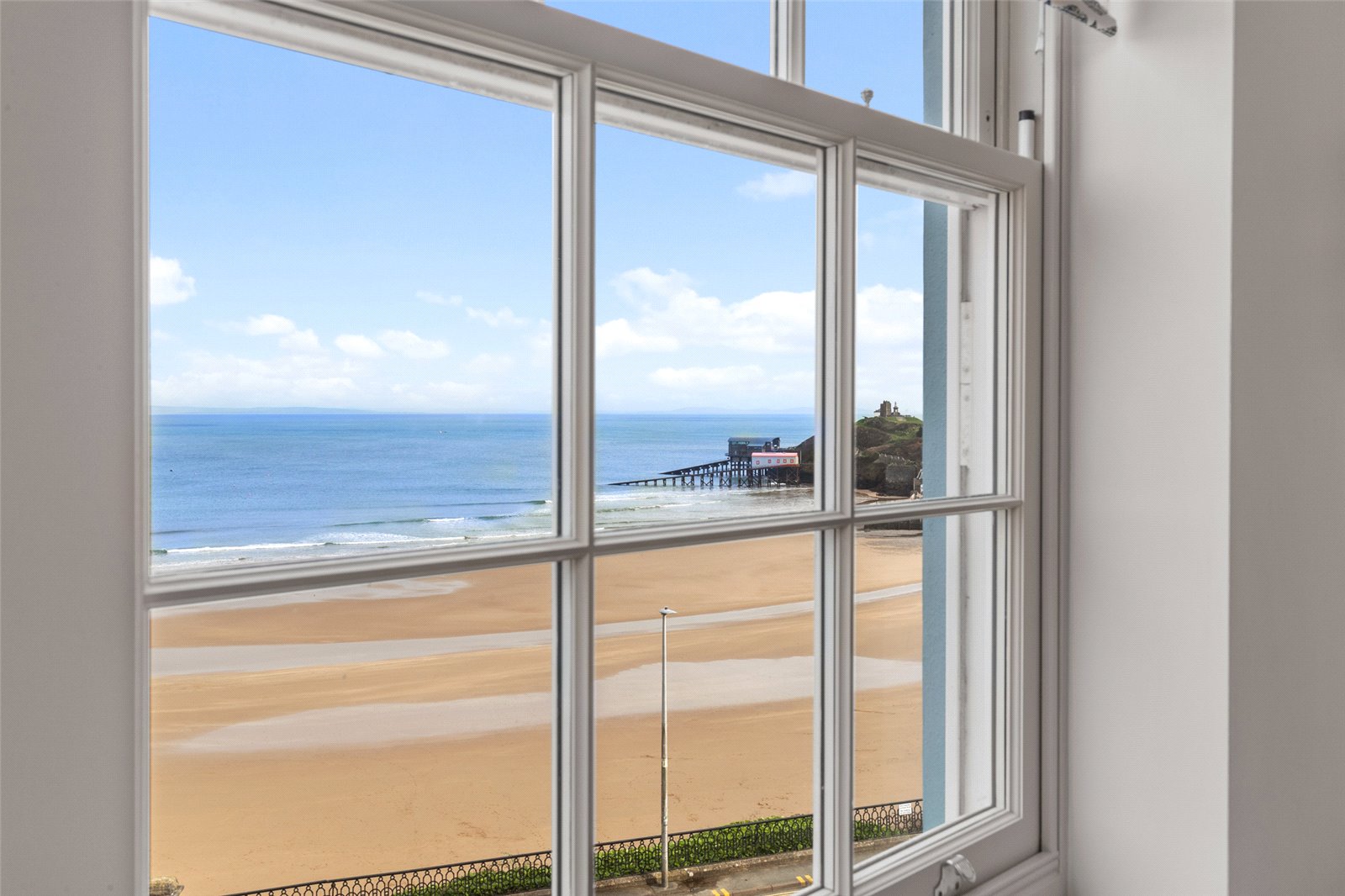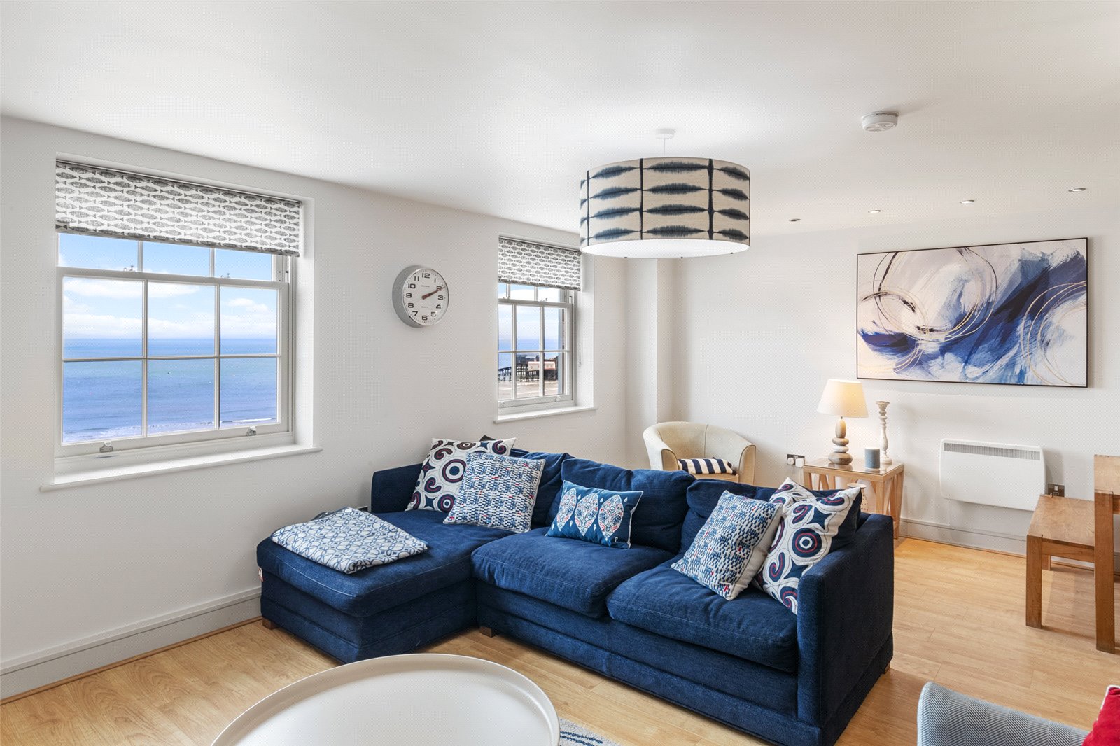 open plan living kitchen room, 2 ceiling lights, ceiling spot lights, 2 wall mounted radiators, 2 sash windows with a beautiful panoramic view of north beach, wooden flooring.