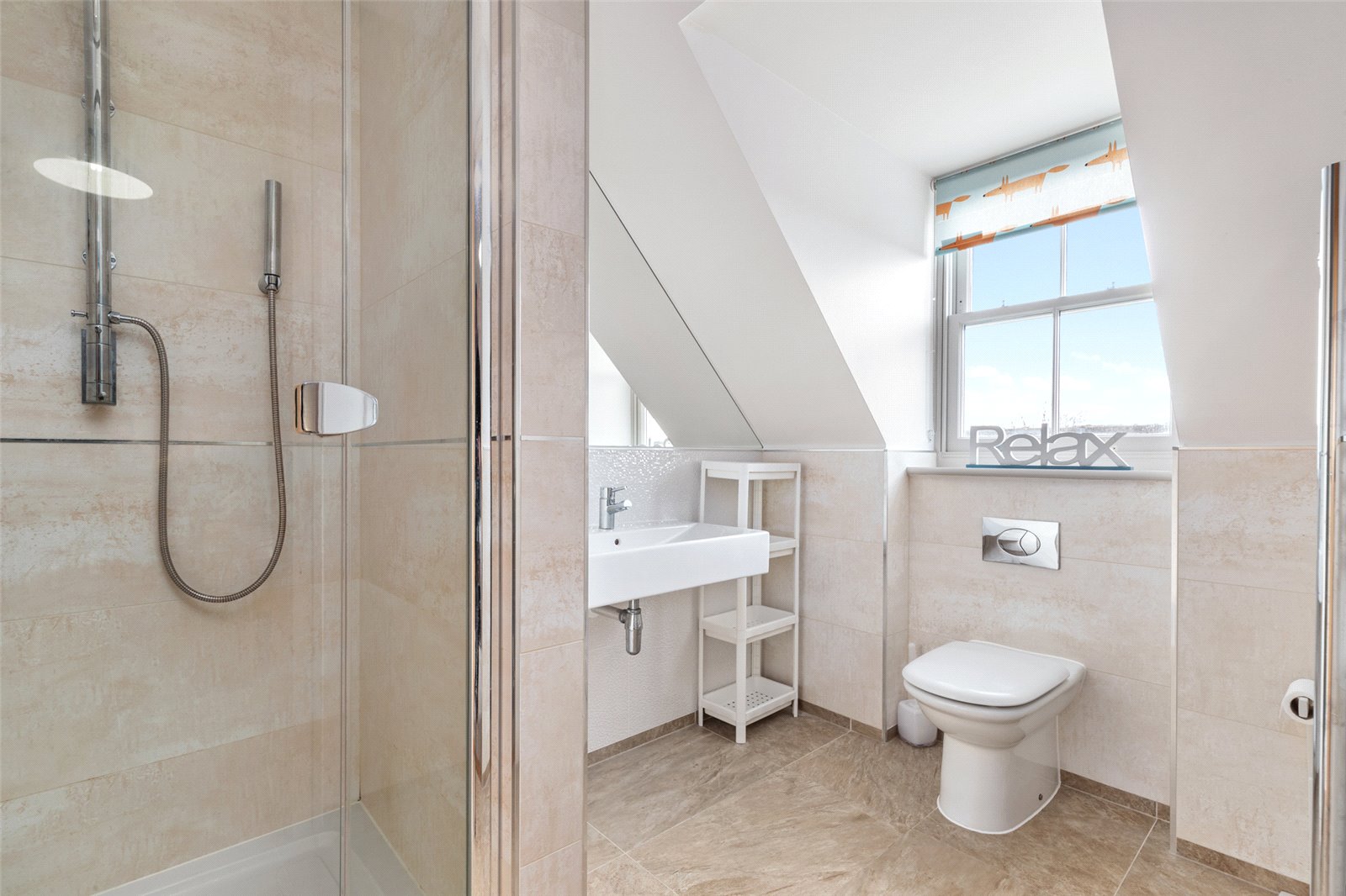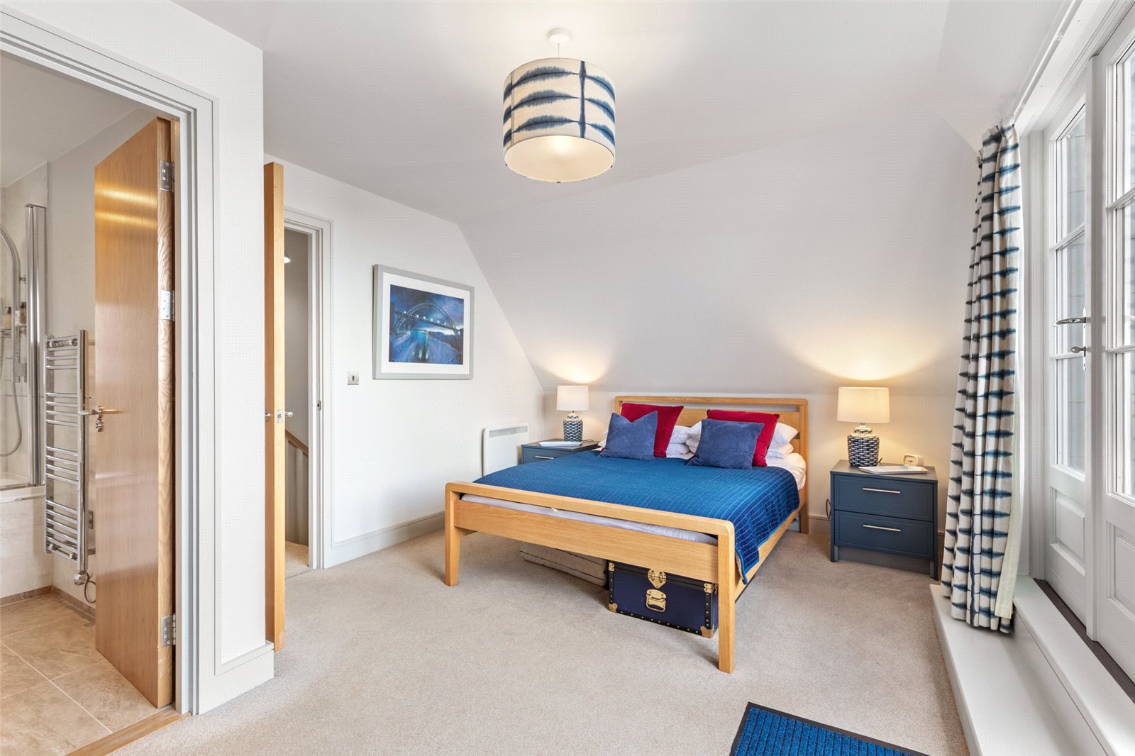ceiling light, carpeted flooring, wall mounted radiator, sash window facing south west, 2 single beds, 3 chest of draws, ensuite tiled flooring, large roca basin, sash window, spot light, water fall shower, glass door, tiled walls and towel