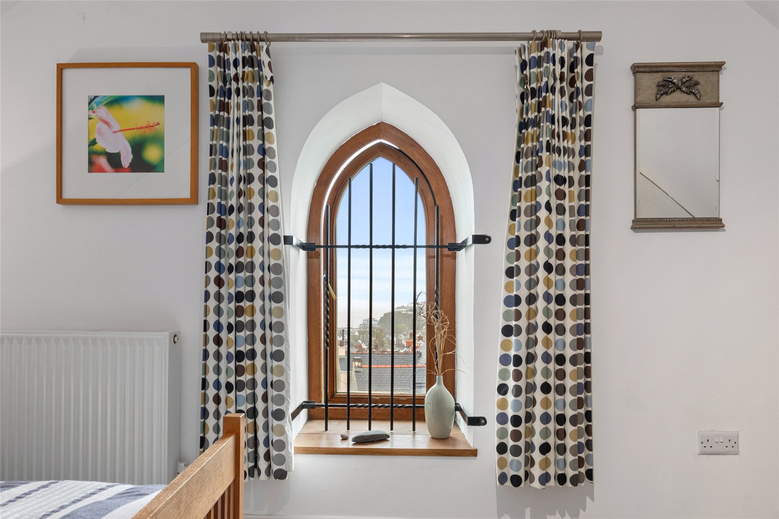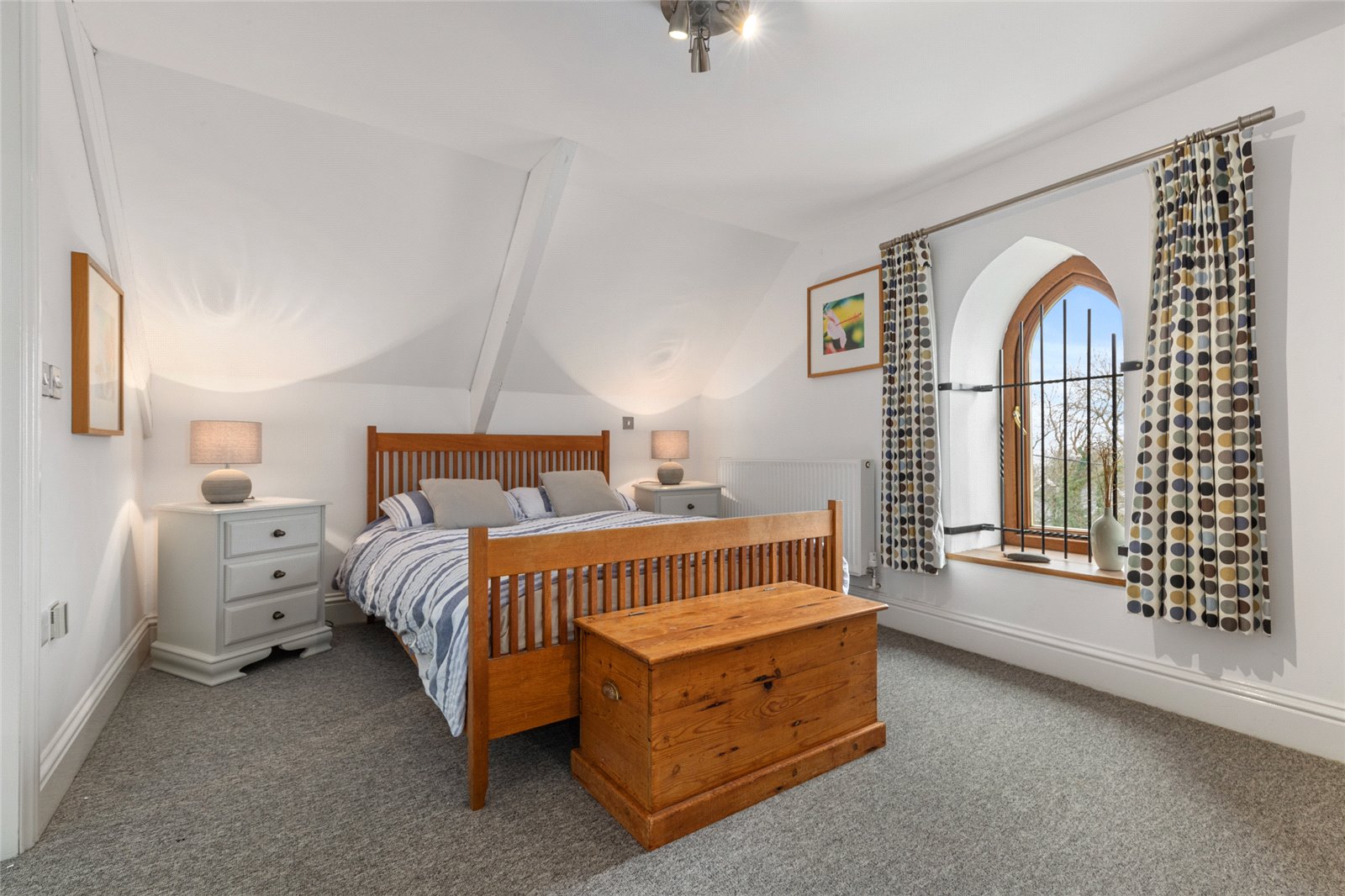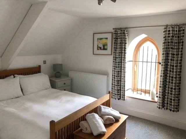 uPVC double glazed arched window, carpeted, ceiling light, radiator, exposed painted roof trusses, door to: