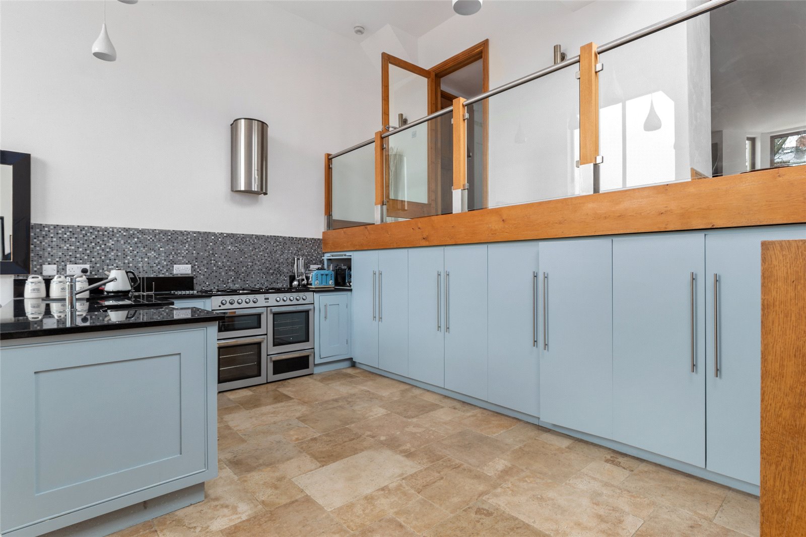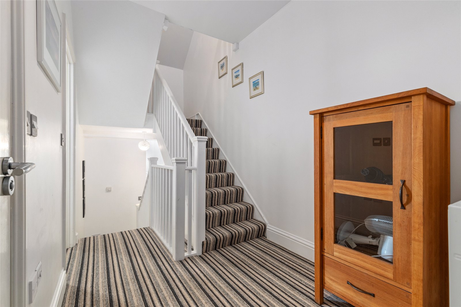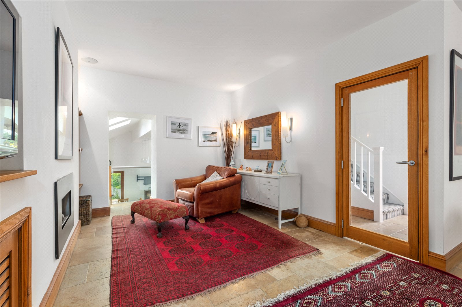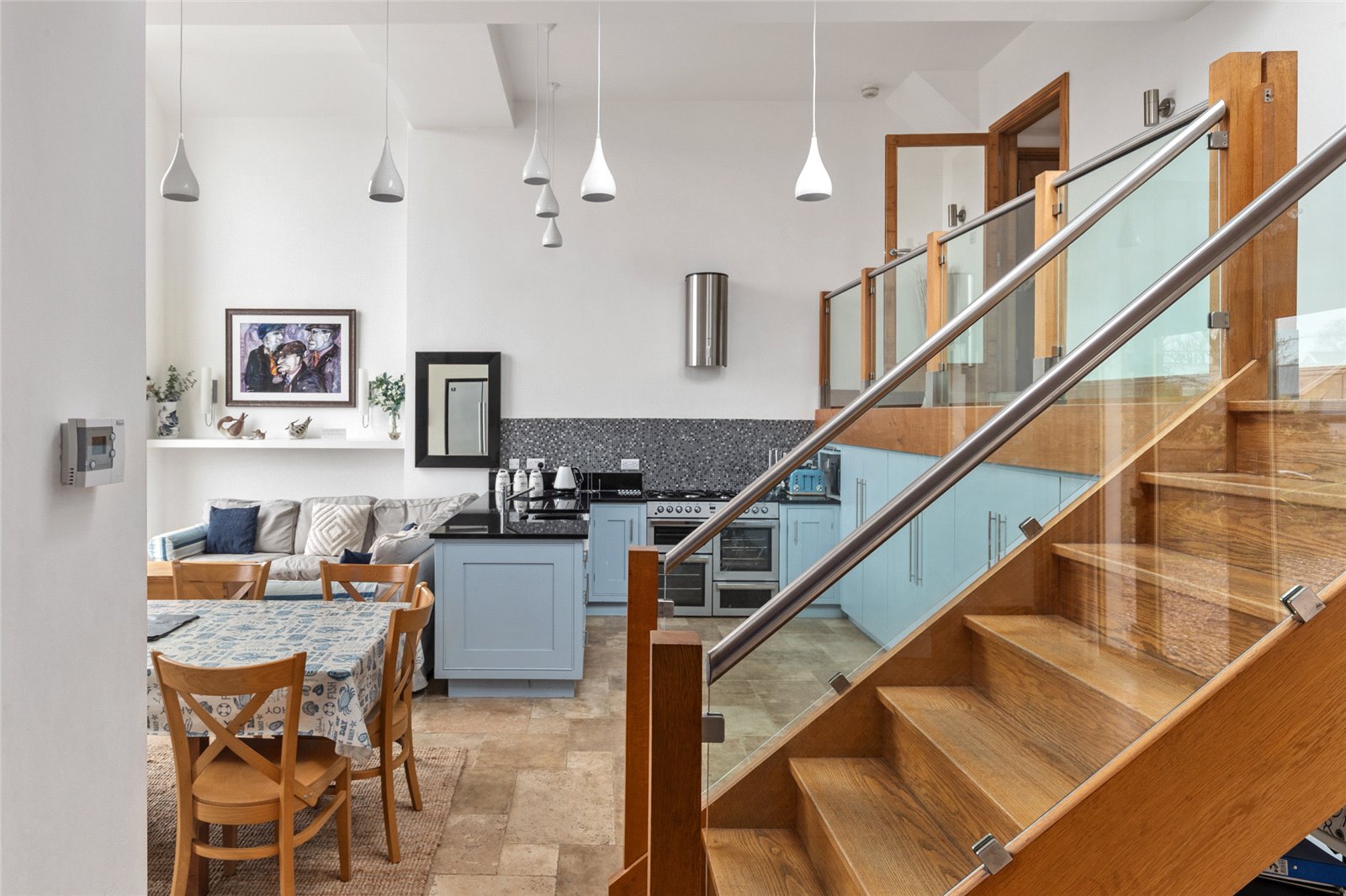 Glass balustrade with brushed stainless steel rails, oak staircase to lower ground floor, two roof windows, wall lights.