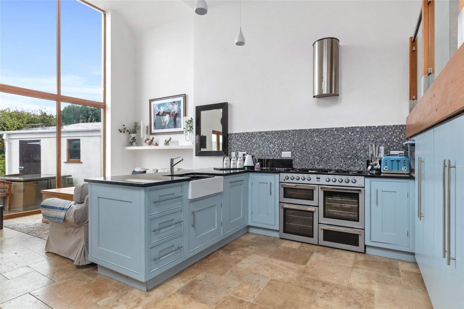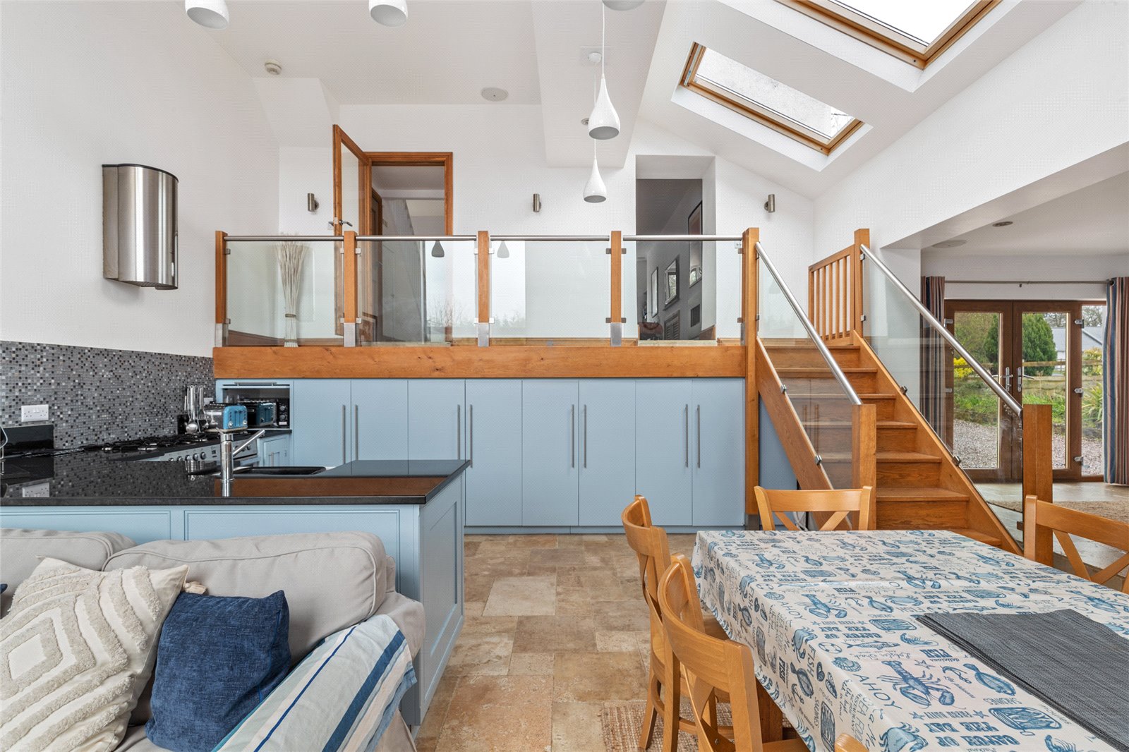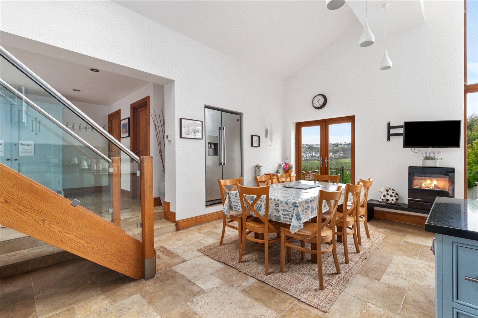 A wonderful space bathed in light with uPVC double height glazed panels to rear garden, uPVC double doors to garden, uPVC double glazed doors to front, natural stone flooring throughout, stylish lighting, range of kitchen units with inset ceramic sink and mixer tap, granite worktop, mosaic tiled splashback, modern extractor unit, built-in dishwasher, space for gas range cooker, concealed storage for microwave, space for table and chairs, space for lounge seating, stove type gas fire, alcove for large American style fridge/freezer, tv point, wall lights, door to bathroom, doors to built in-storage with space and plumbing for washig machine, further space for seating area.