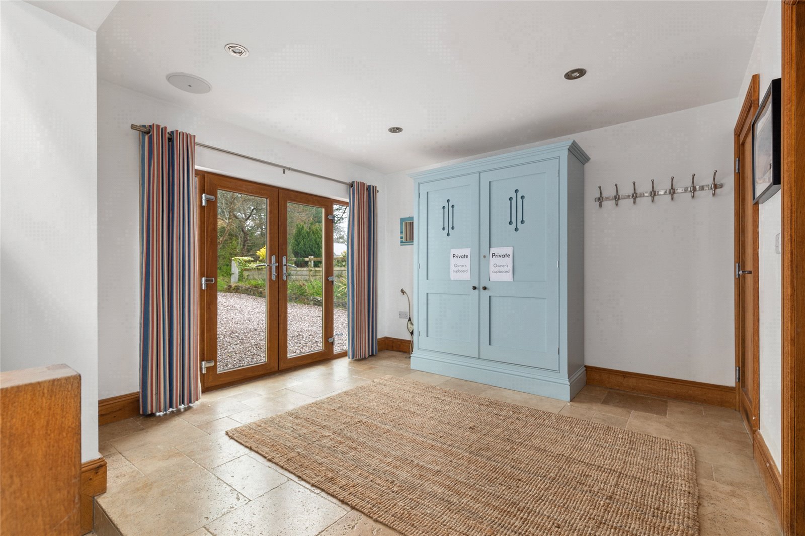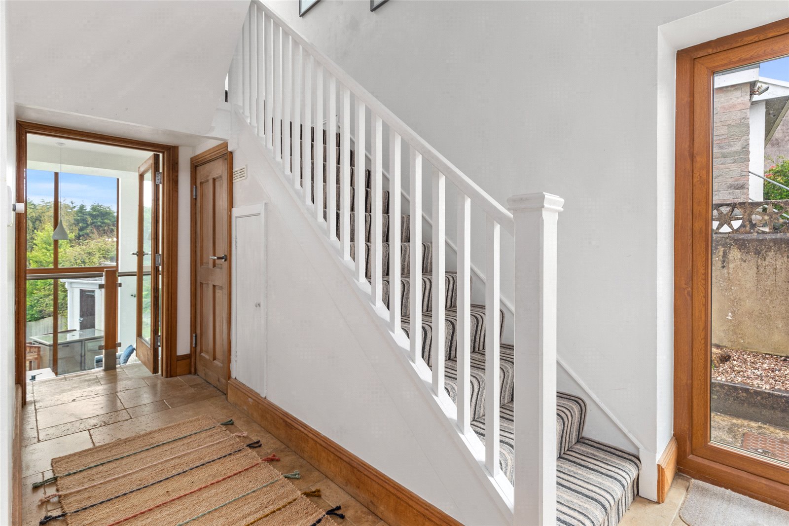 uPVC glazed door to outside, natural stone tiled flooring, carpeted staircase to first floor with understairs storage cupboard housing Worcester gas boiler, wall lights, glazed door to lounge, glazed door to mezzanine area, built-in cupboard housing hot water system.