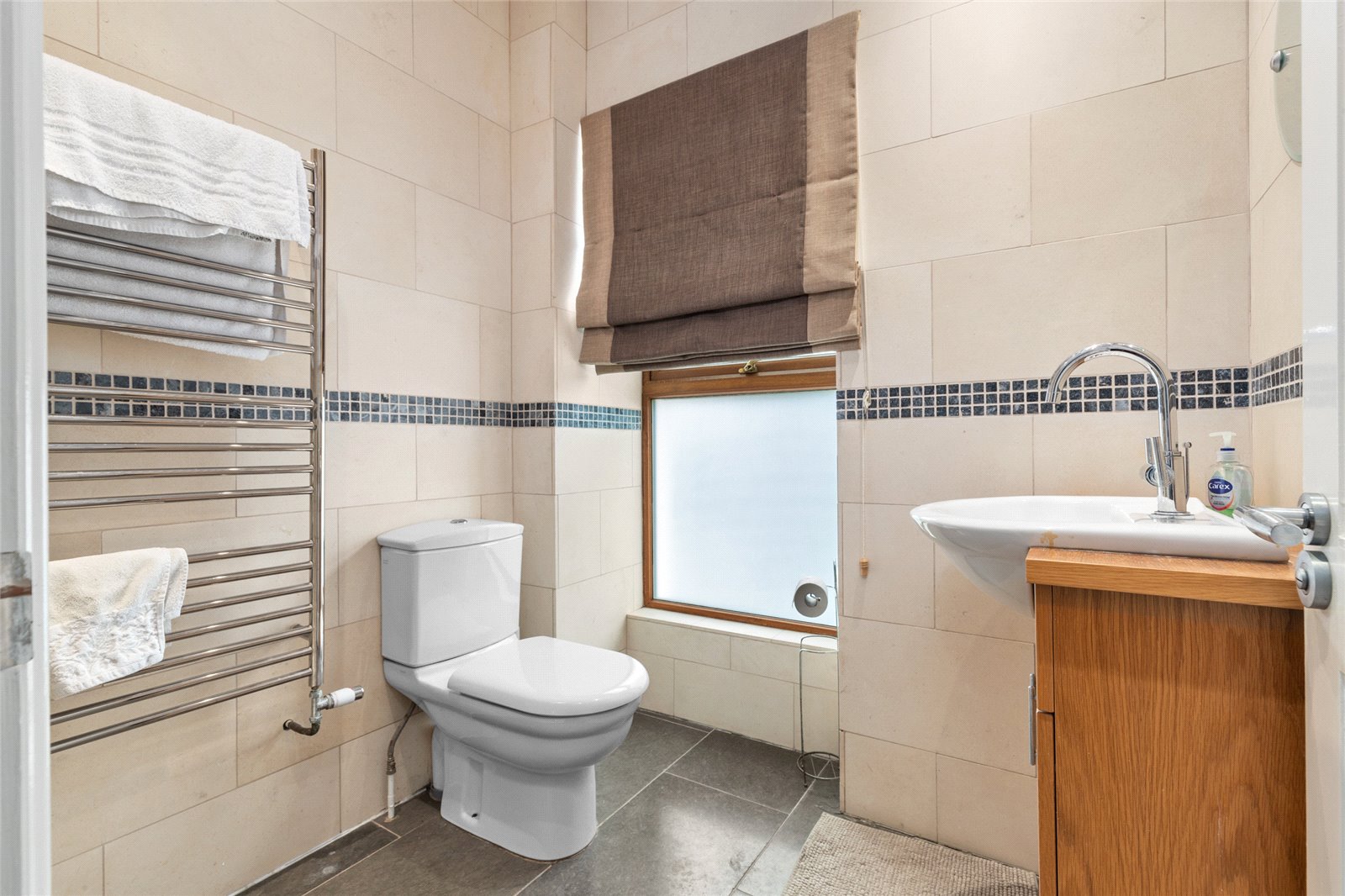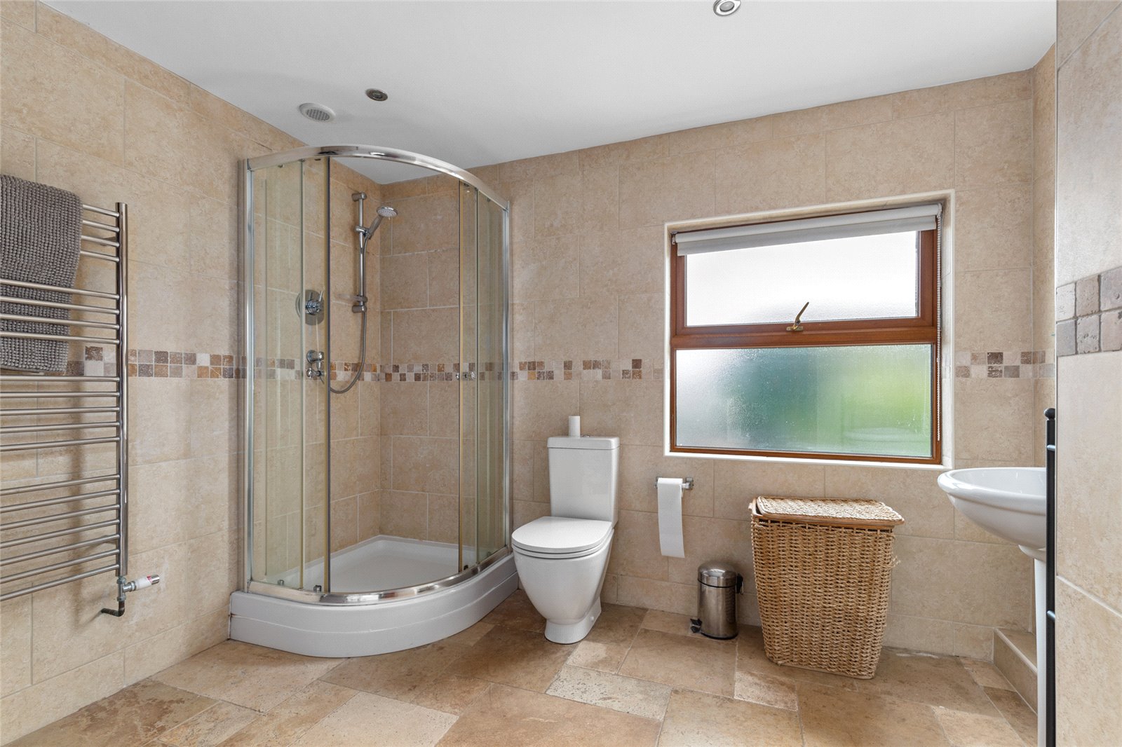 Obscure uPVC double glazed window to rear, fully tiled walls and floor, wc, wash hand basin, glazed shower cubicle with mains shower, extractor, inset ceiling lights, ladder style towel radiator.